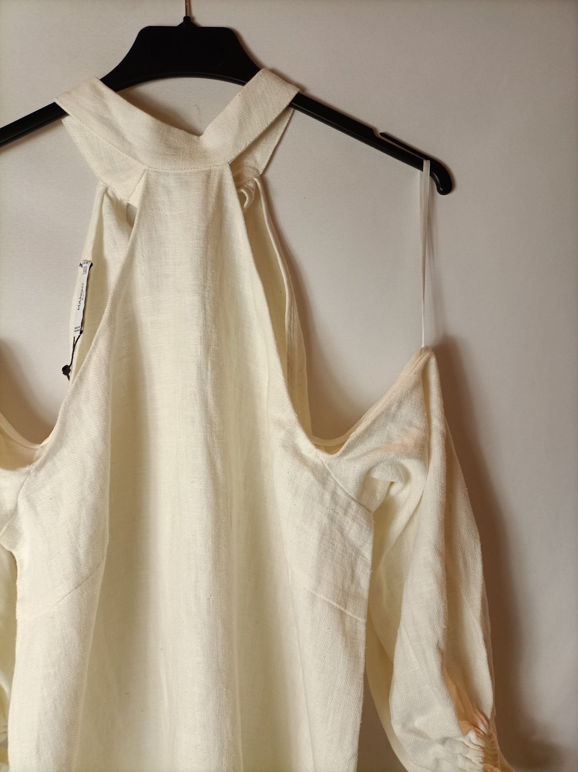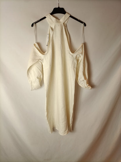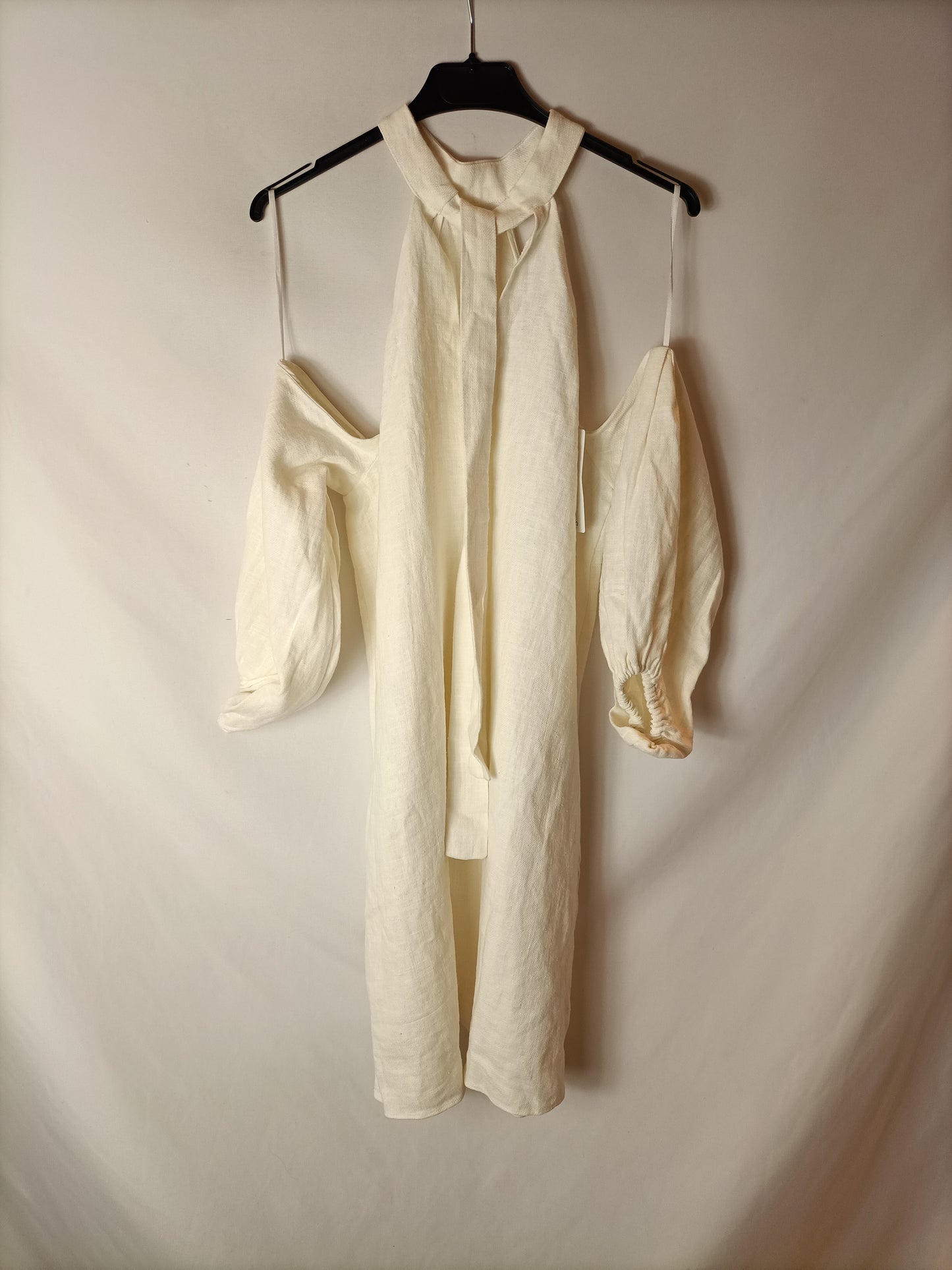 NUEVO CON ETIQUETA. Vestido blanco roto con los hombros al aire. lazada en el cuello.