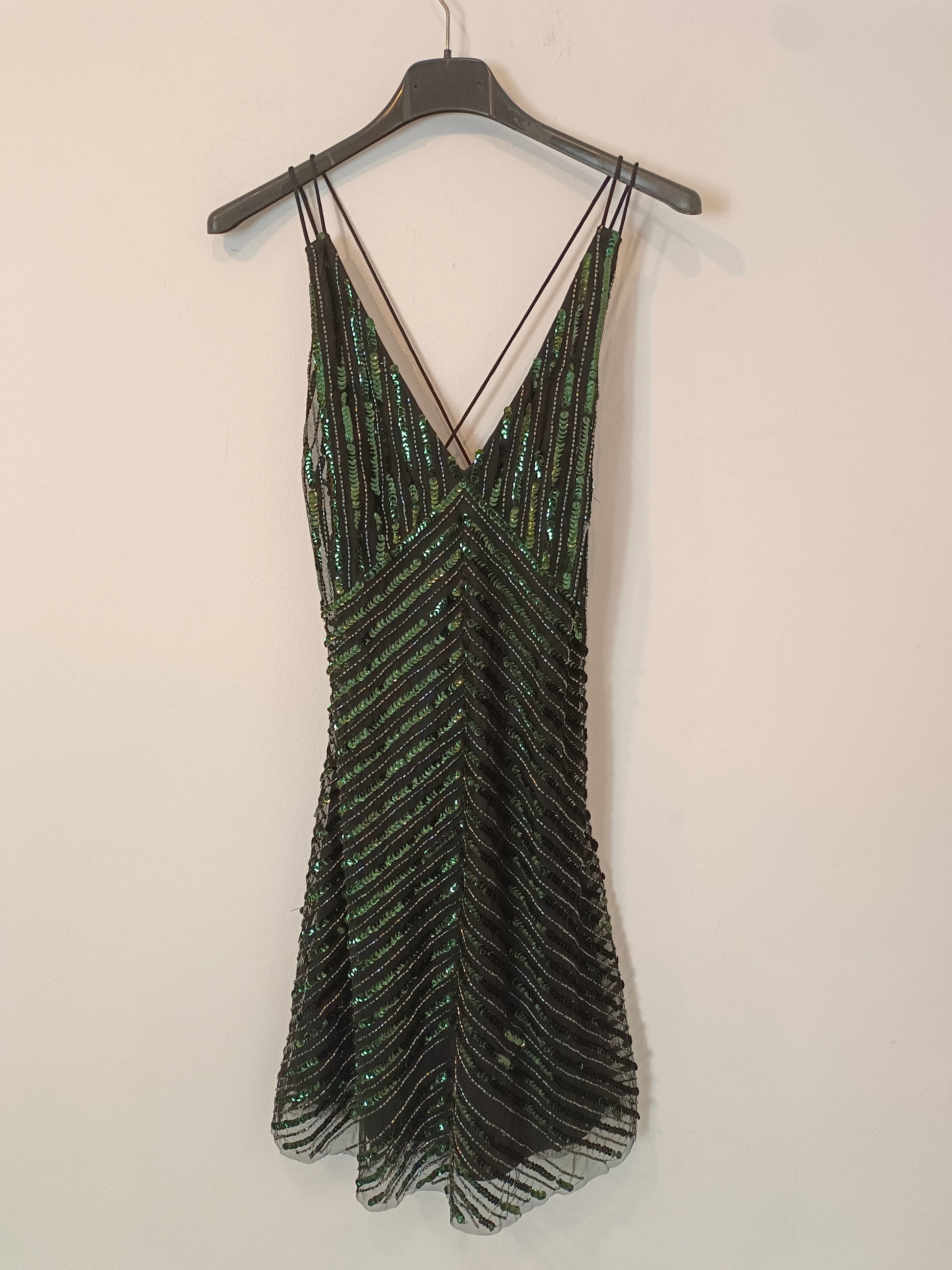 Vestido corto negro con lentejuelas verdes. de sisa a sisa cm largo cm
