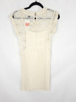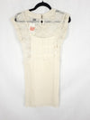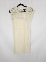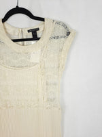 NUEVO CON ETIQUETA. Vestido corto beige plisado por la parte de abajo y encaje por arriba. Lleva forro interior y tiene para cinturón. Es semielastico. Largo 99 cm