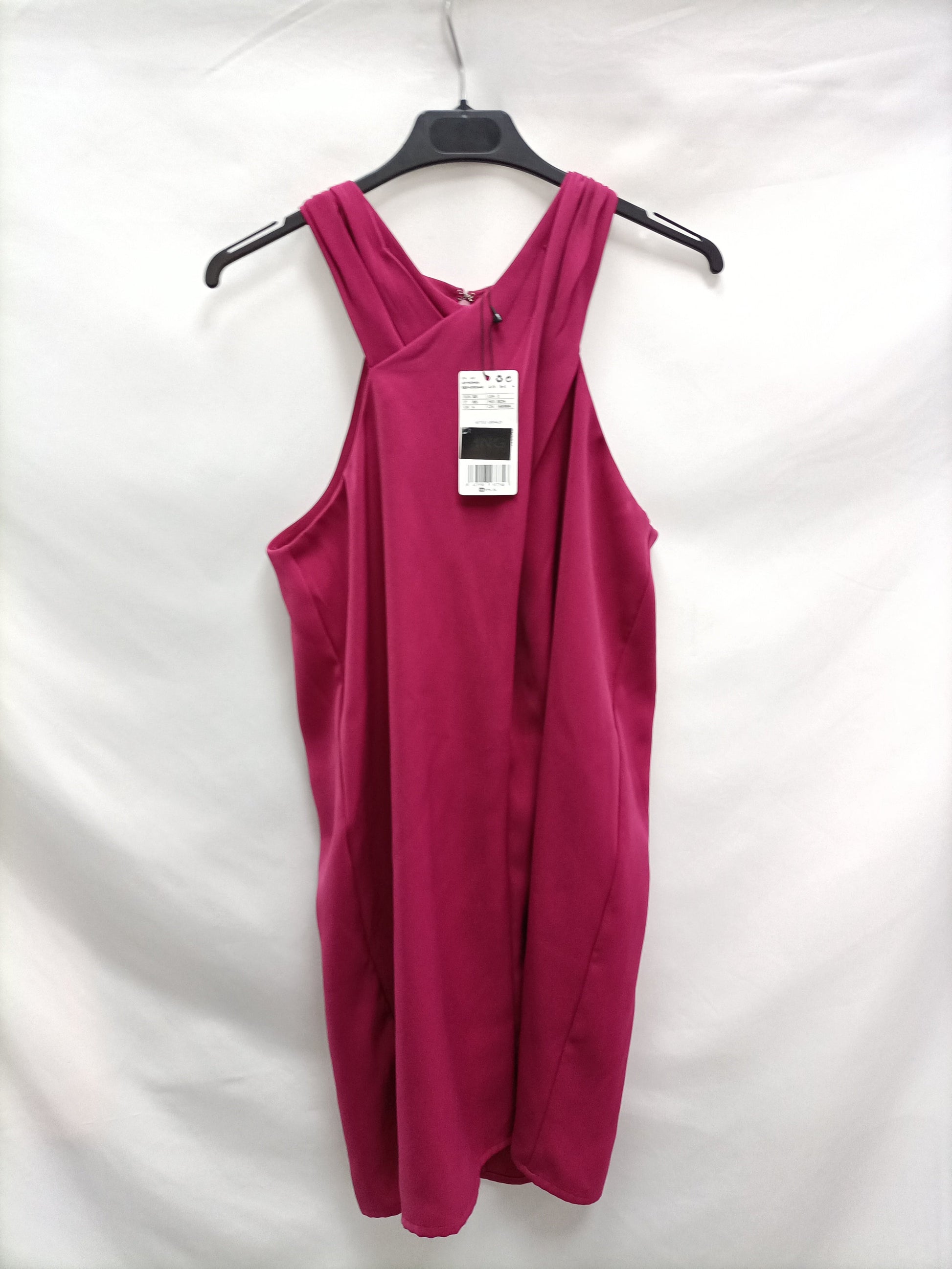 NUEVO CON ETIQUETA. Vestido corto color buganvilla con el escote halter cruzado. No elastico. De sisa a sisa 46 cm largo 83 cm