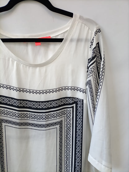 Vestido blanco con detalles negros, es fluido y fino, estilo oversized. Algo transparente. No es elástico. Largo 87 cm