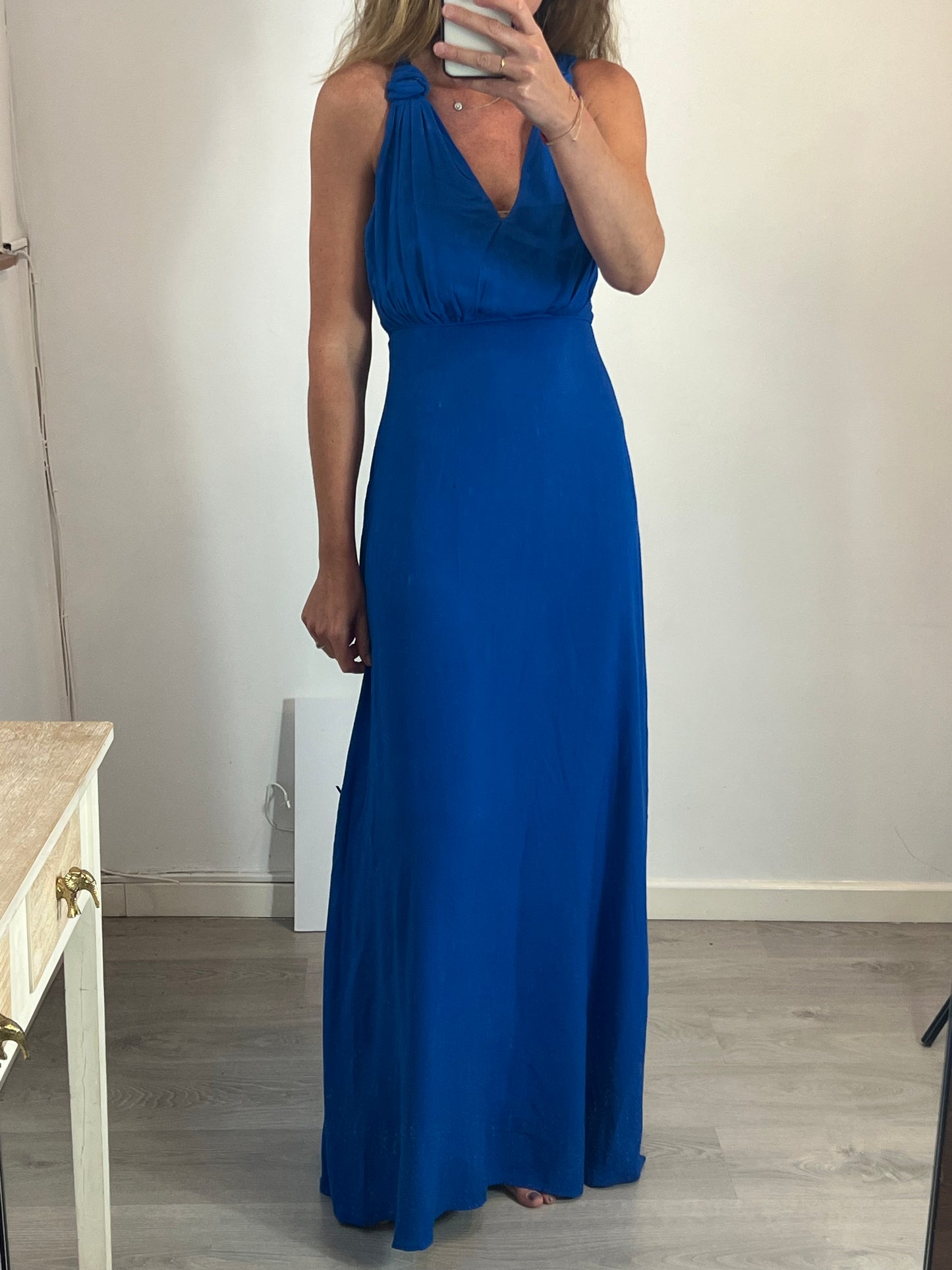 Vestido largo azul klein. De sisa a sisa 38cm, largo 159cm, cibtura 32cm no elastico. Talla como una S