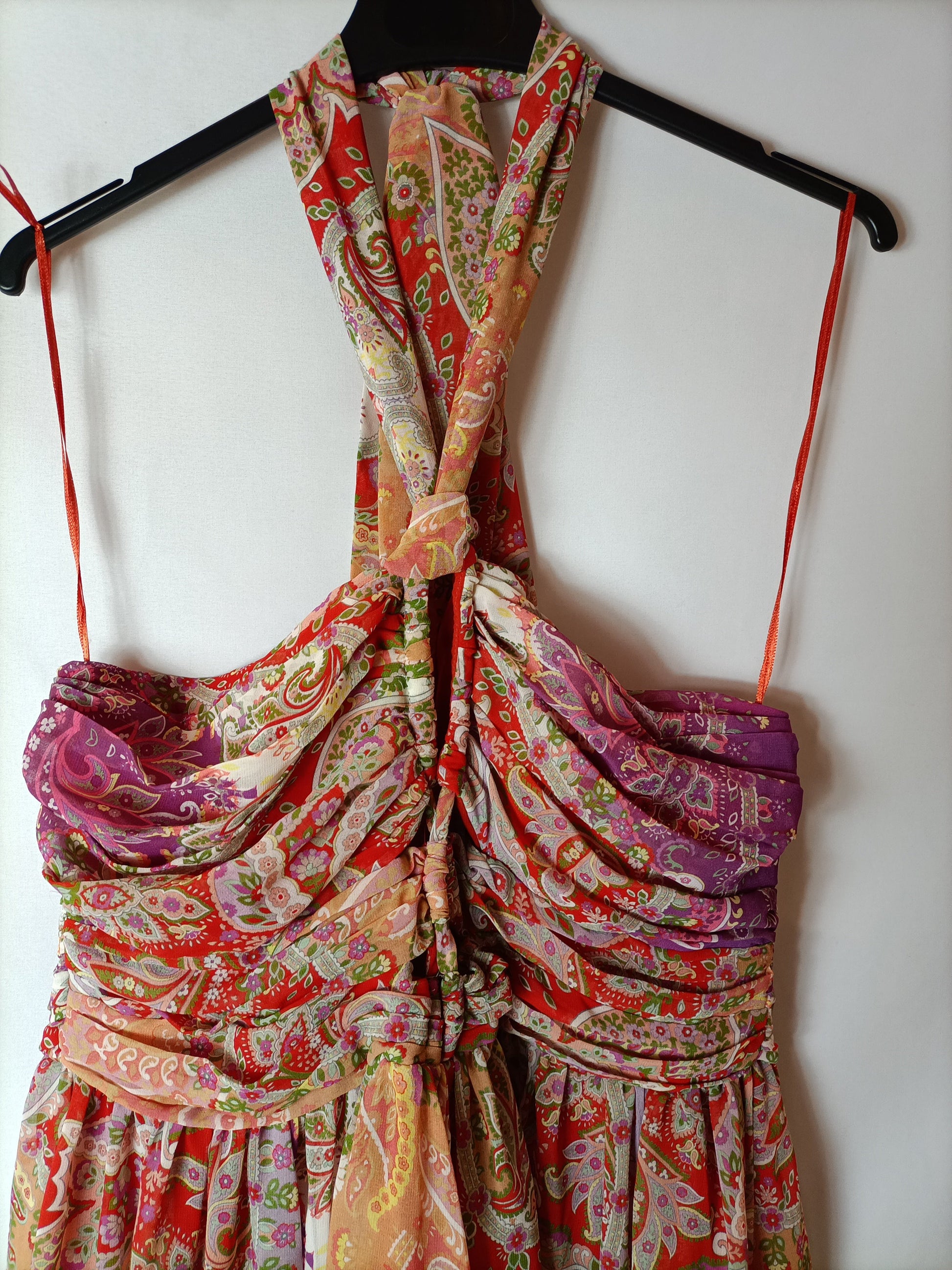 Vestido largo fluido con estampado de flores. Escote fruncido y atado al cuello.
