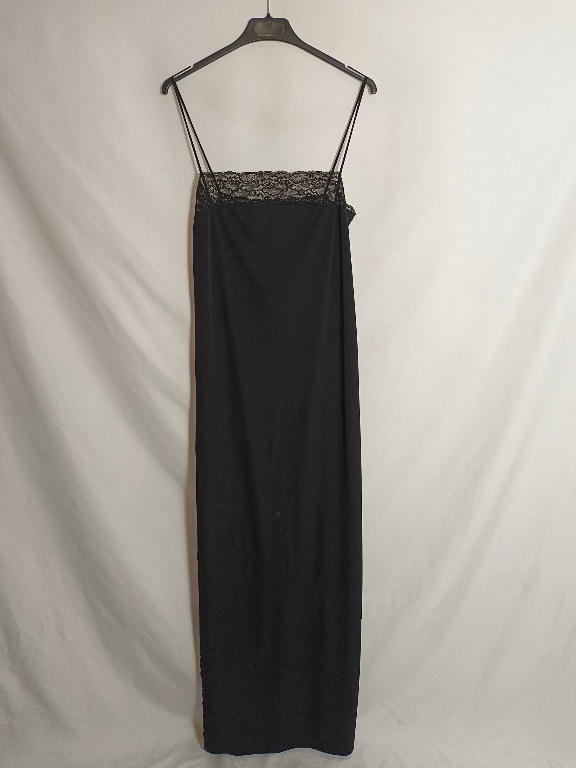 Vestido largo lencero negro con detalles de encaje y apertura lateral