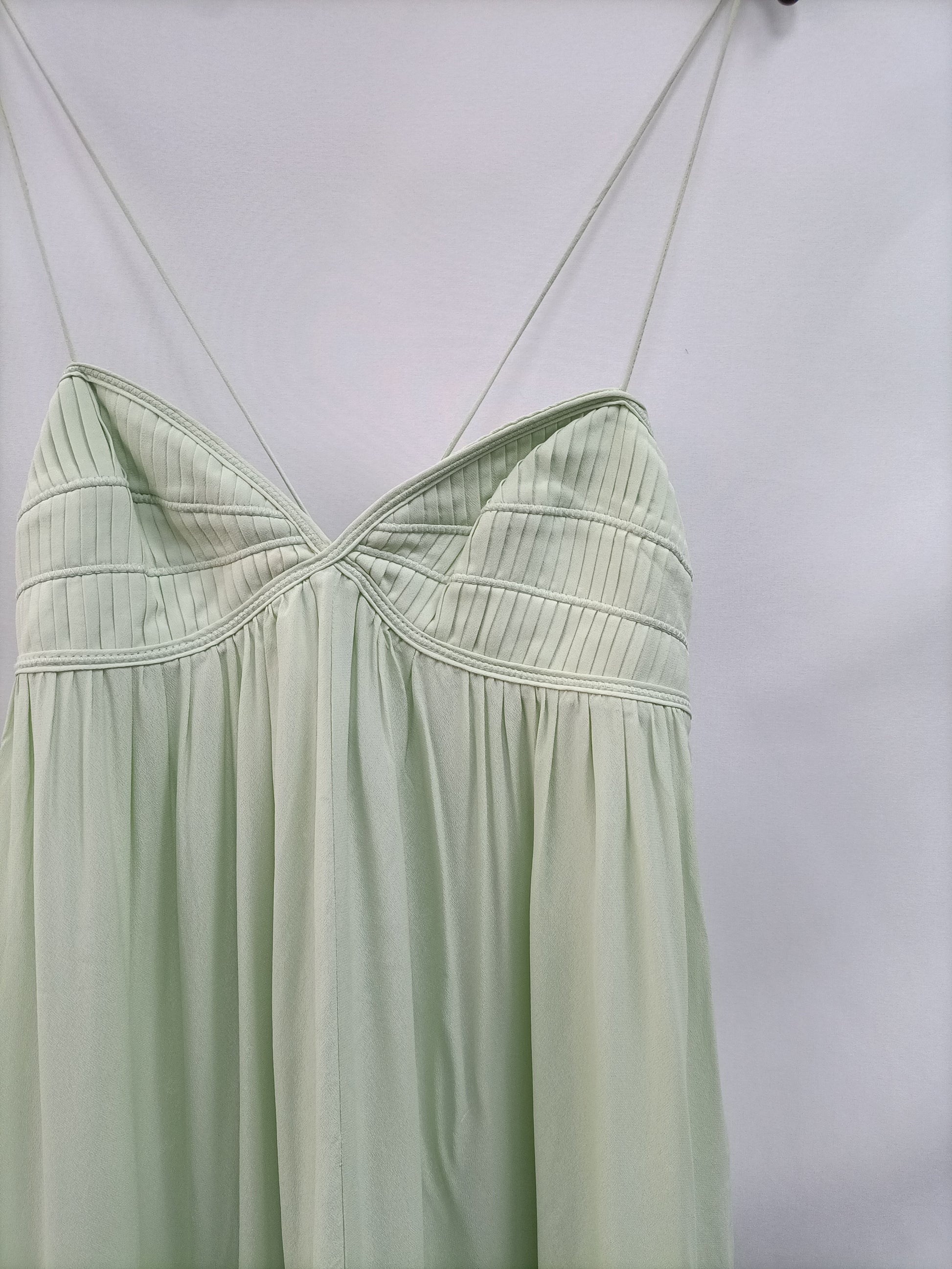 NUEVO CON ETIQUETA, Vestido largo verde pastel con apertura en la parte de abajo. de sisa a sisa 43 cm largo 170cm