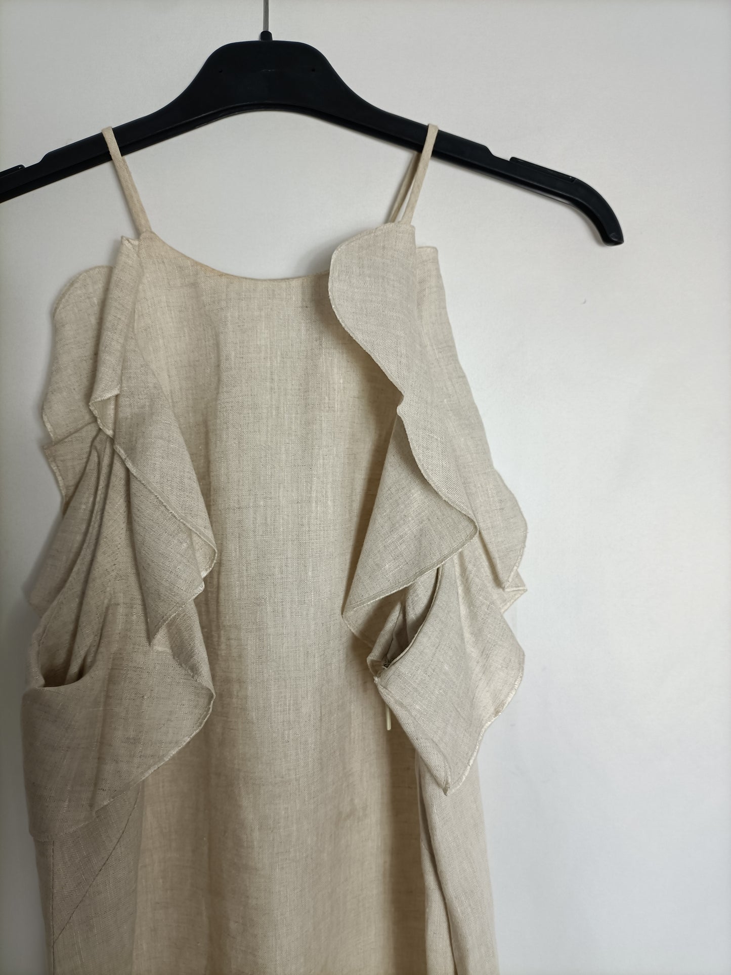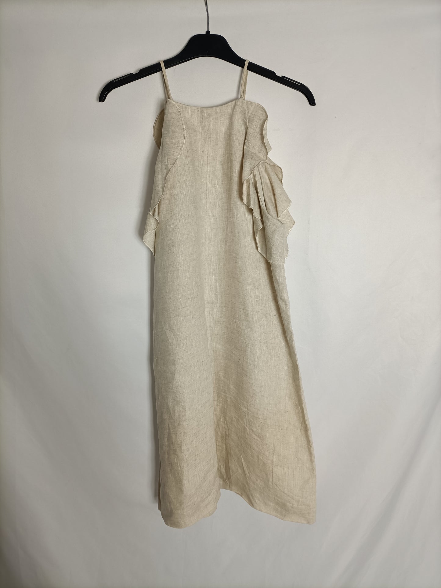 vestido beige lino fluido no elástico, cuello halter con volantes. de sisa a sisa 42 cm y largo 91 cm