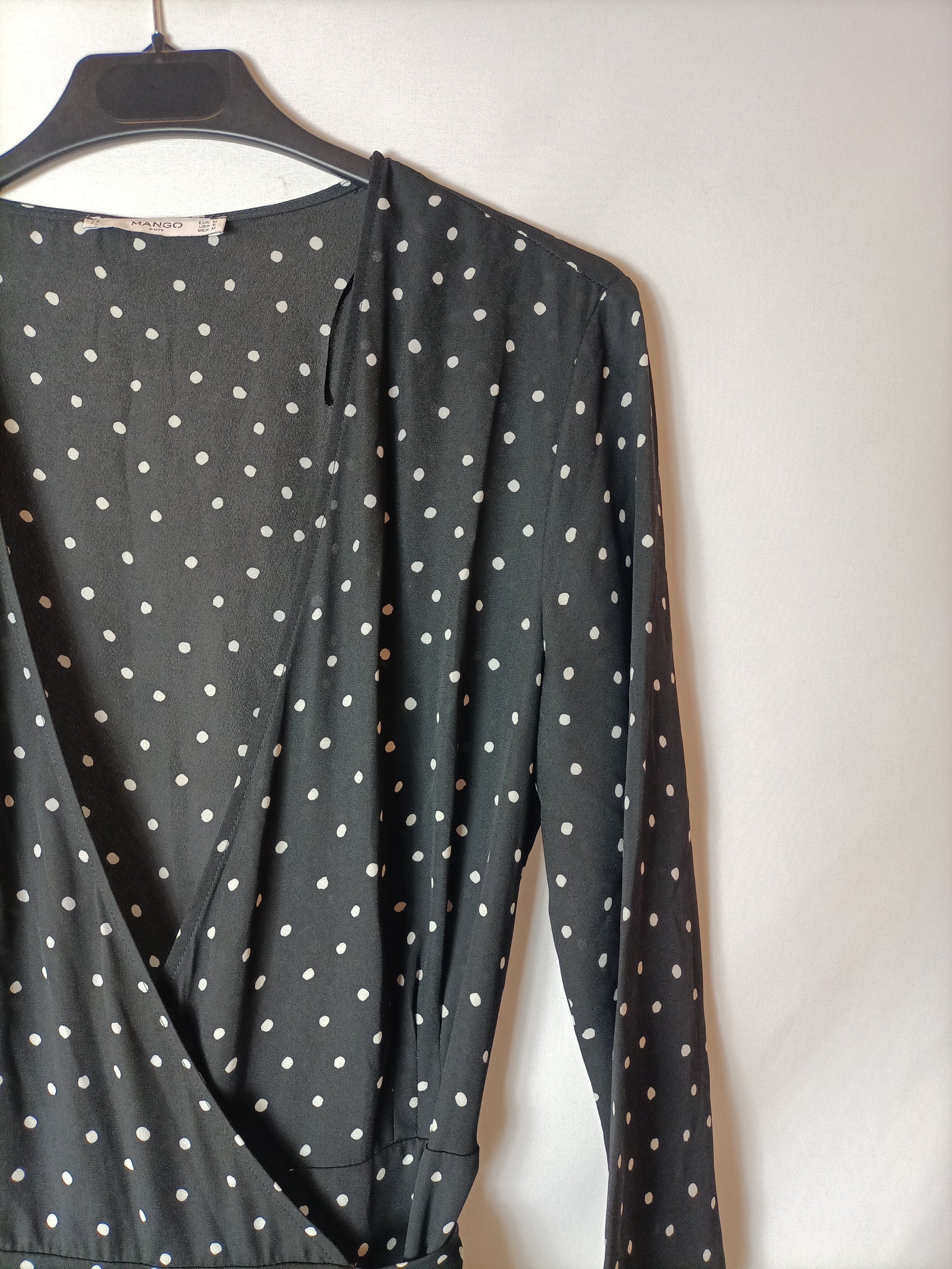 Vestido midi cruzado lunares. Tejido no elástico. Parte de la falda con forro y de cintura hacia arriba semitransparente. De sisa a sisa 48 cm