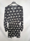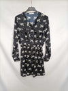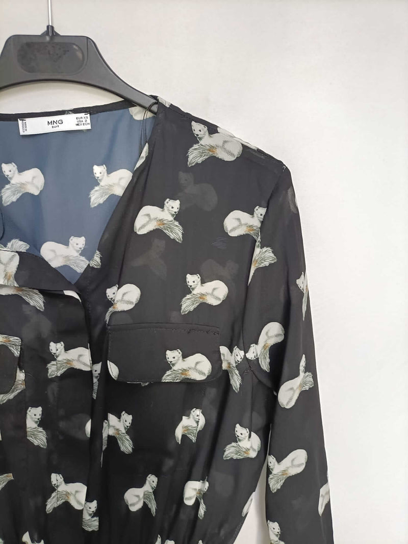 Mango.xs. vestido negro fluido con estampado de animal en blanco. Parte de arriba semitransparente y falda con forro. Elastico en la cintura. De sisa a sisa 51 largo 75 cmv