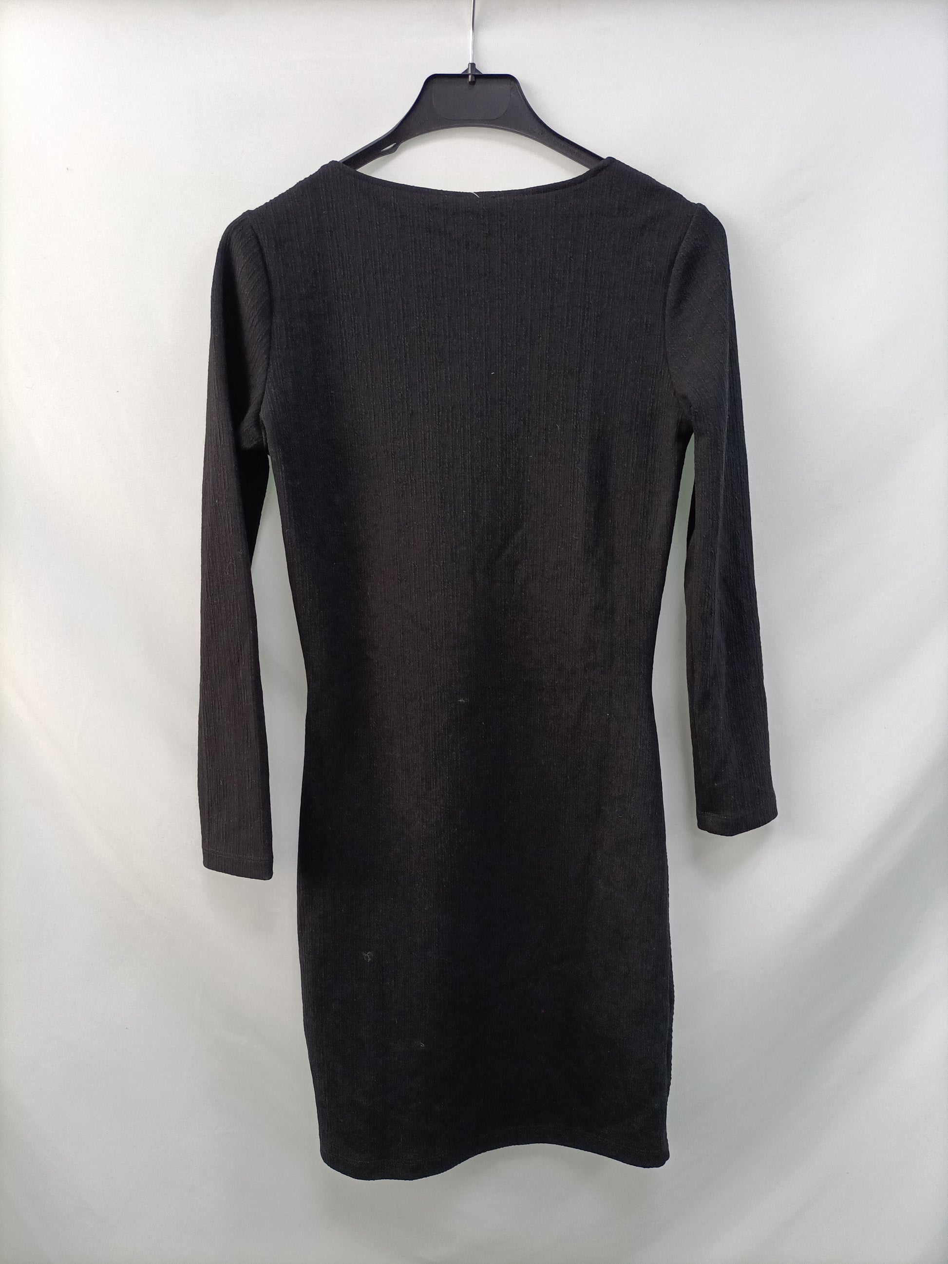 Mango. Vestido negro ajustado con el escote en pico. Es elástico y tejido con textura. Largo 82 cm