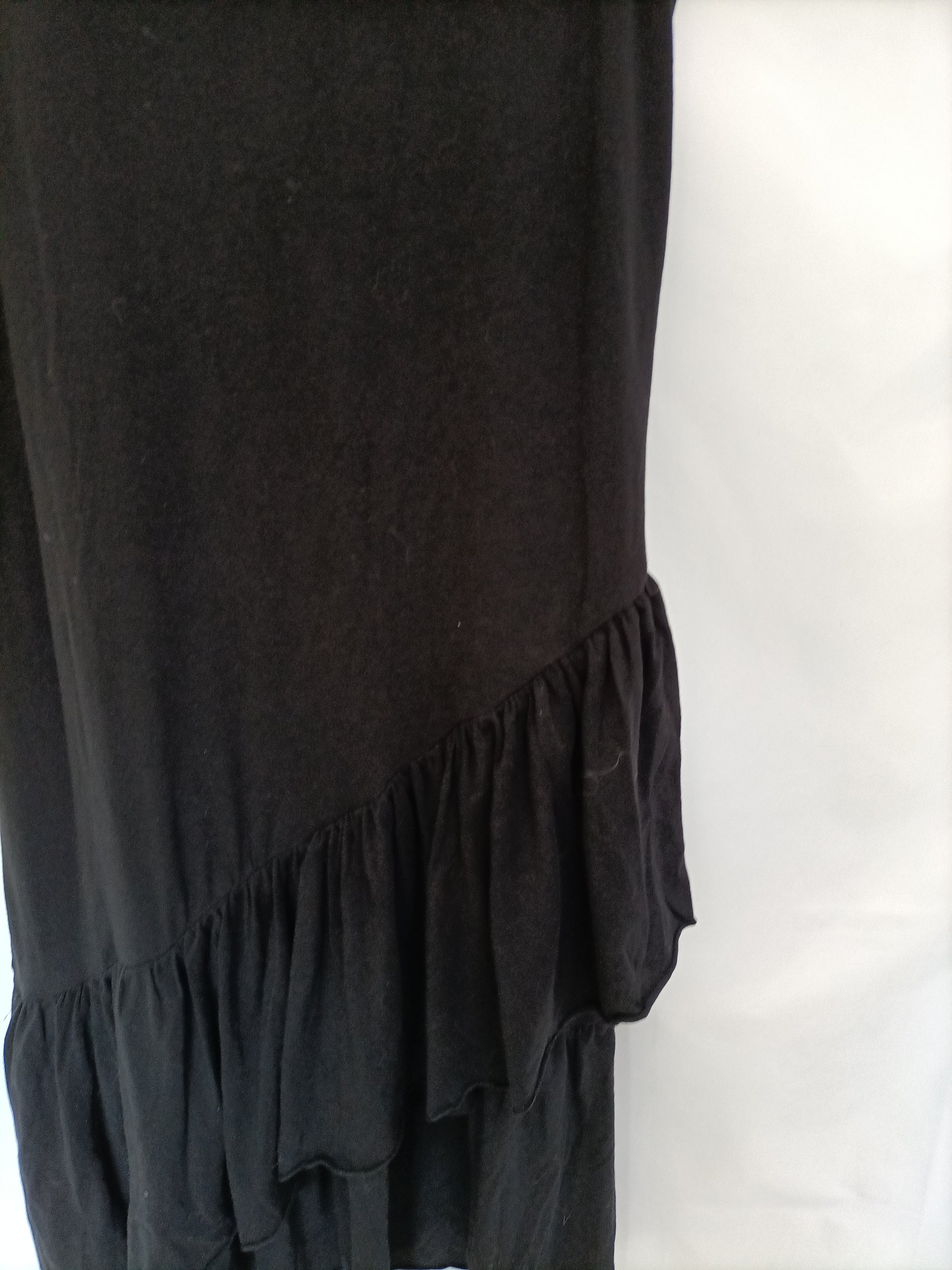 Vestido negro son mangas de tejido de camiseta con volantes en la parte de abajo.