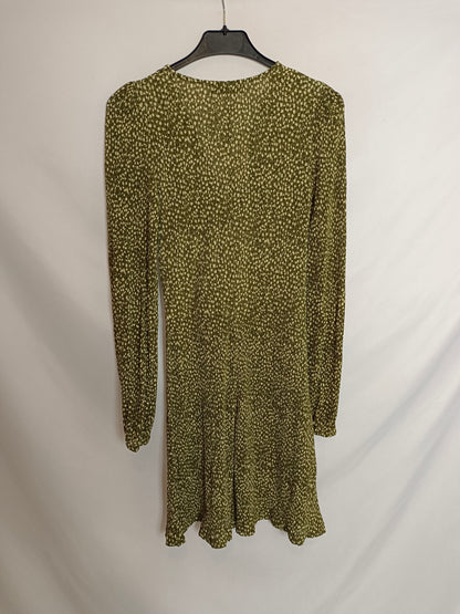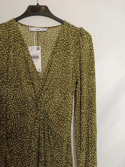 NUEVO CON ETIQUETA. Vestido corto verde con topos y nudo delantero.