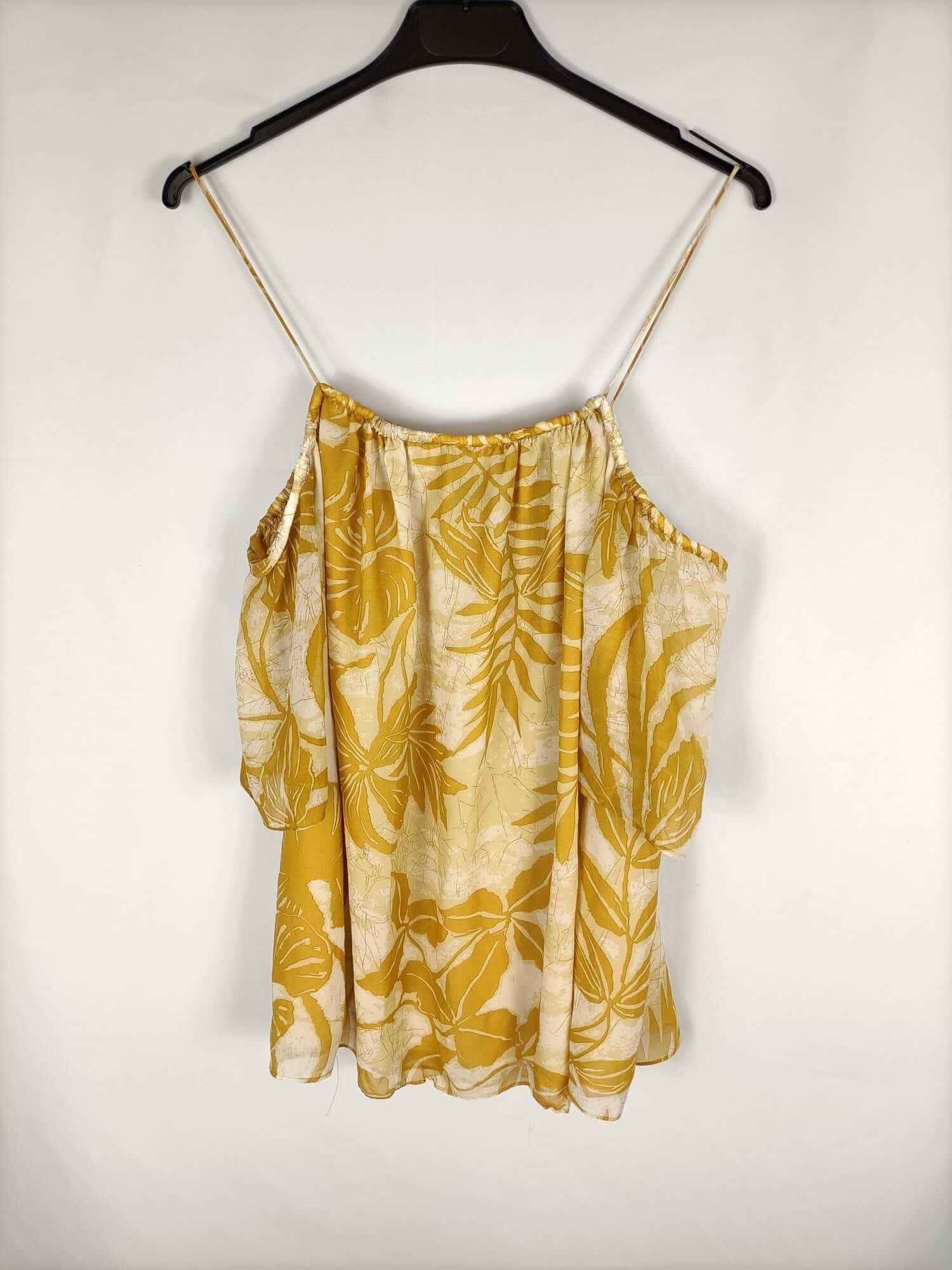 Blusa fluida con estampado de hojas en mostaza. De tirantes y mangas con hombros al descubierto. De sisa a sisa 62 cm largo 70 cm