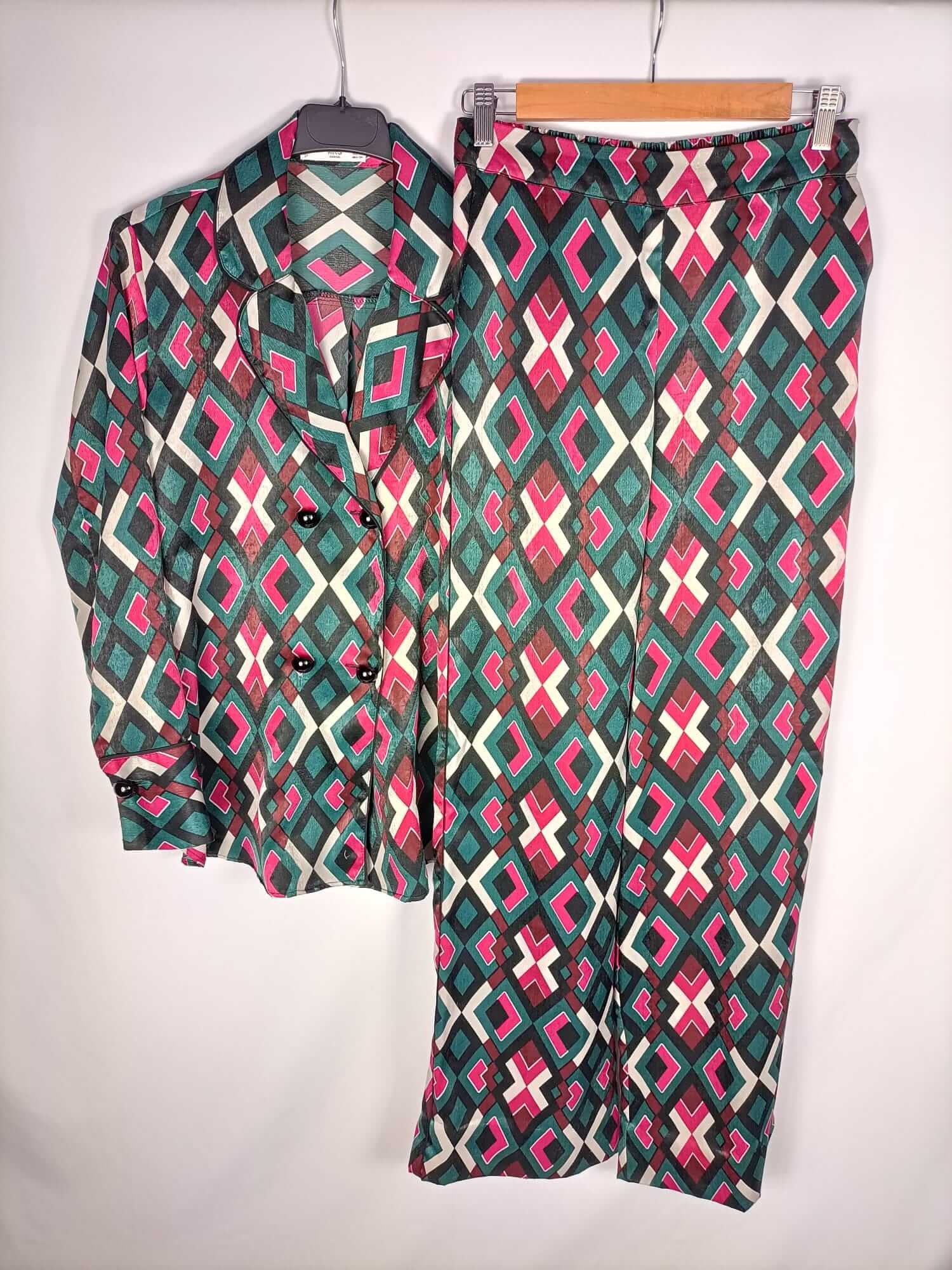 Blusa estampada con forma geométricas, cruzada y estilo pijamera. No elástica. De sisa a sisa 53 cm largo 56 cm