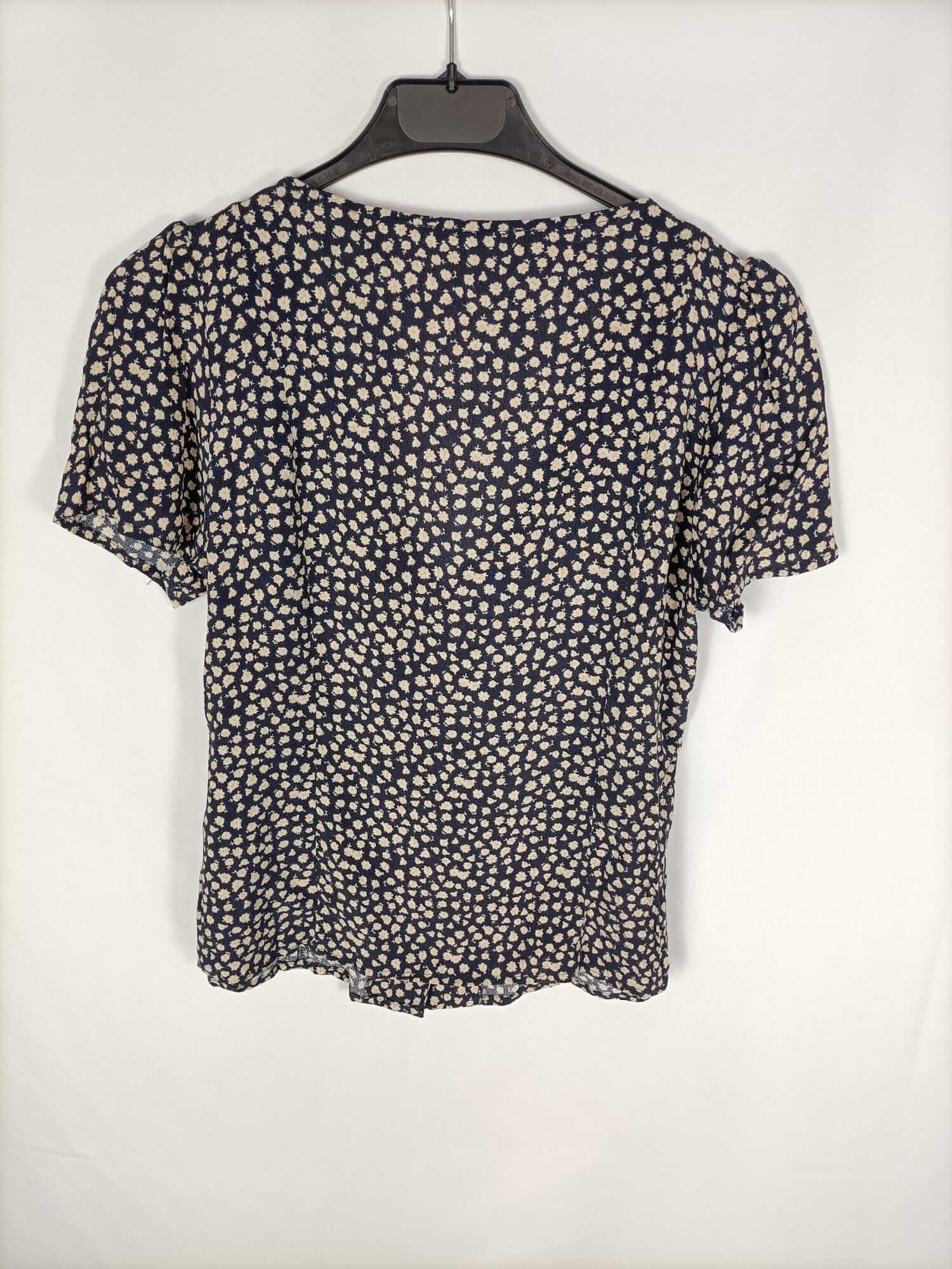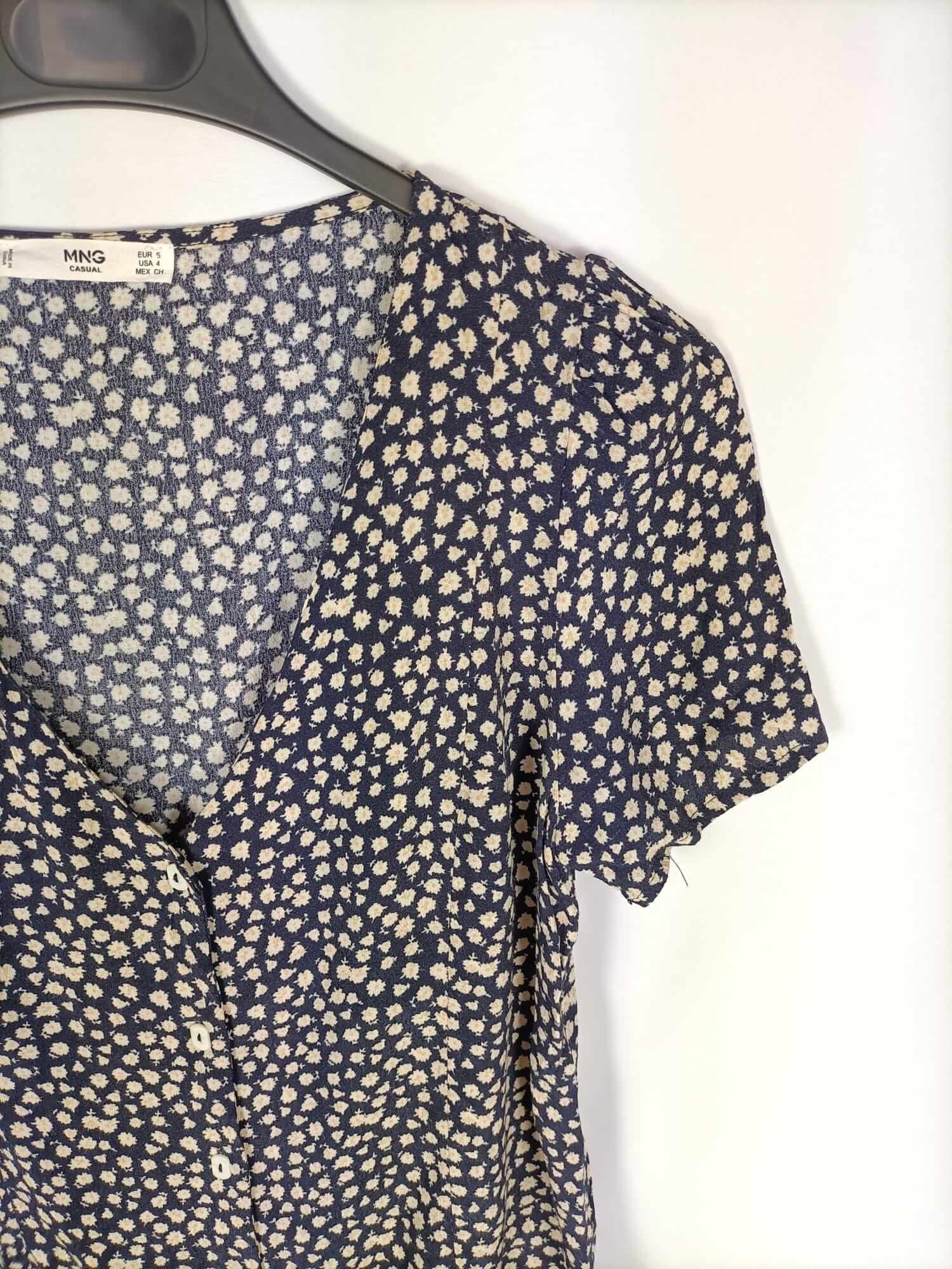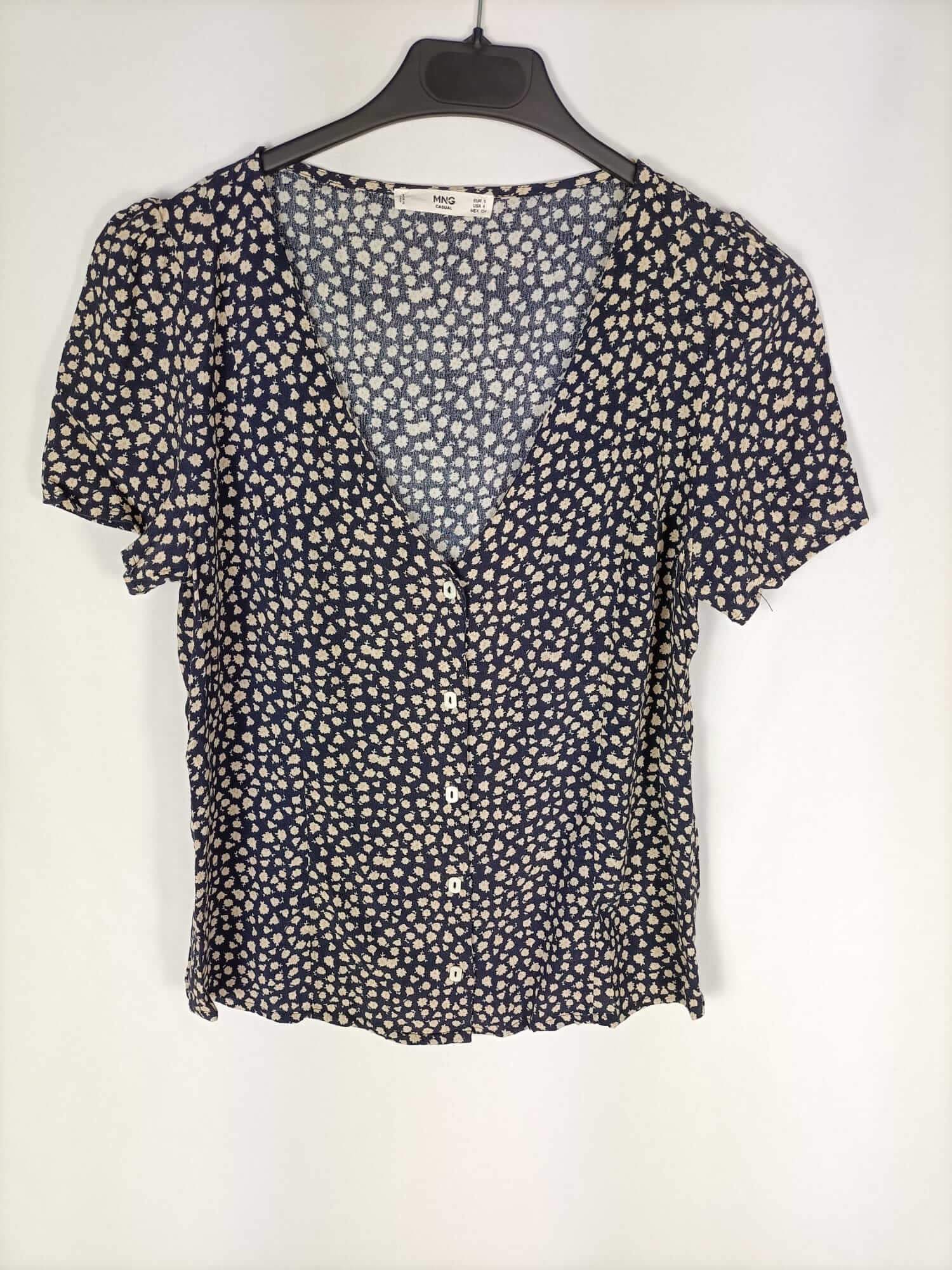 Mango. Blusa fluida azul con margaritas. Abotonada. No elástica. De sisa a sisa 47 cm largo 53 cm