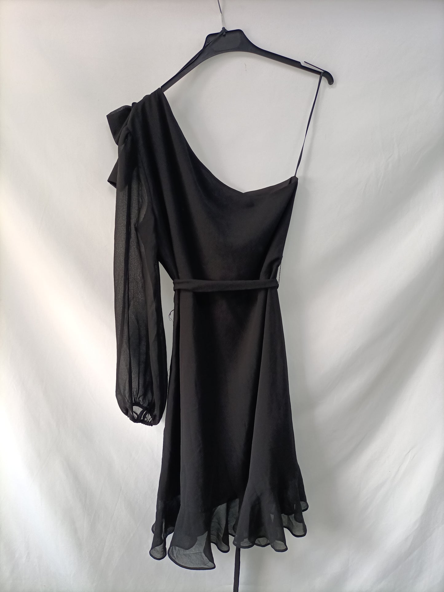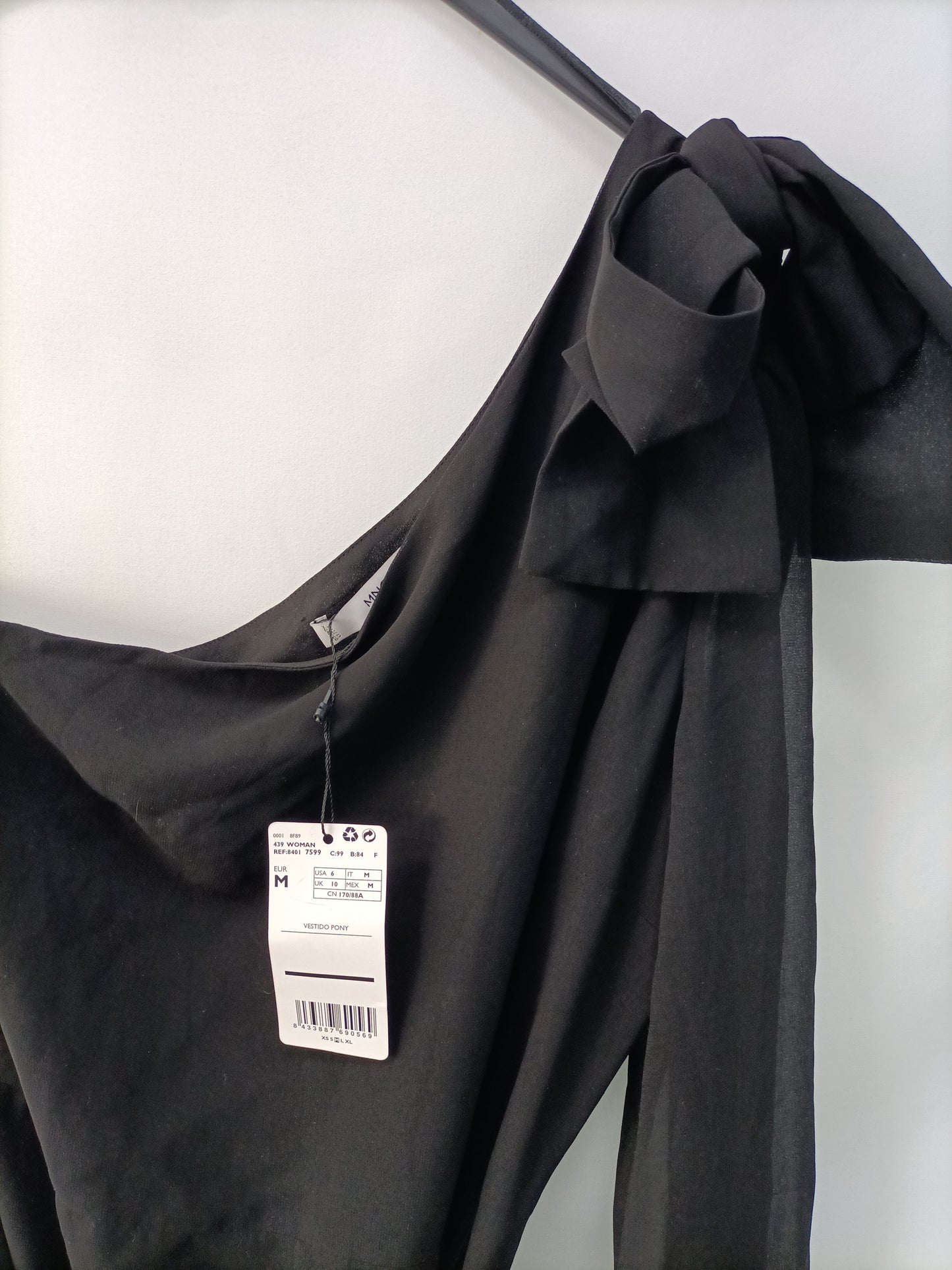 Mango. NUEVO CON ETIQUETA. Vestido midi negro asimétrico con lazada en el hombro y cinturón incorporado. Largo 104 cm