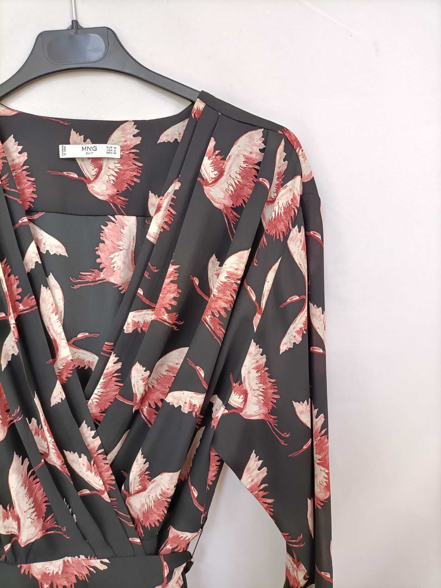 Mango. M. Vestido negro fluido cruzado con están de pájaros. No elástico. De sisa a sisa 46 largo 103 cm