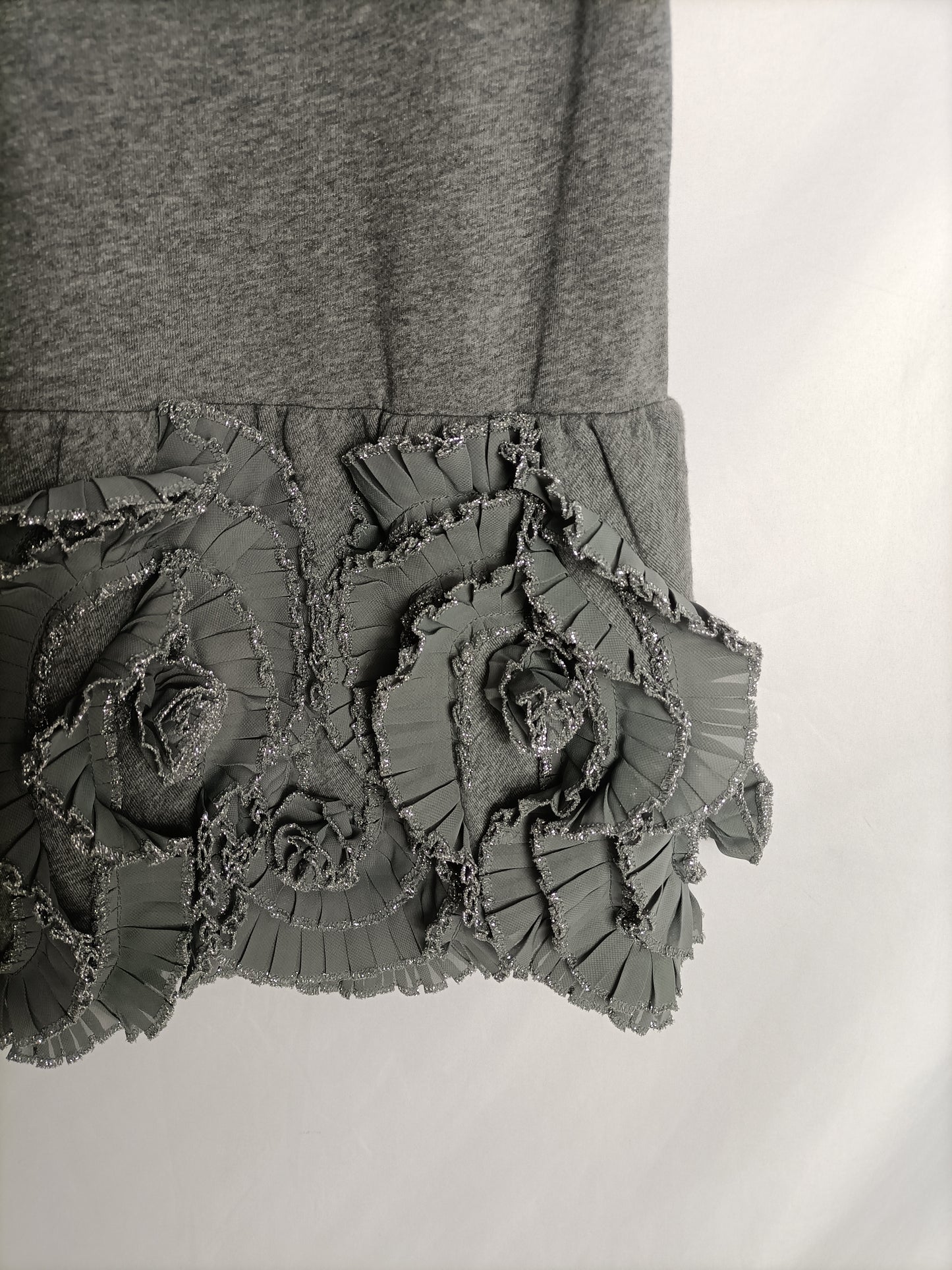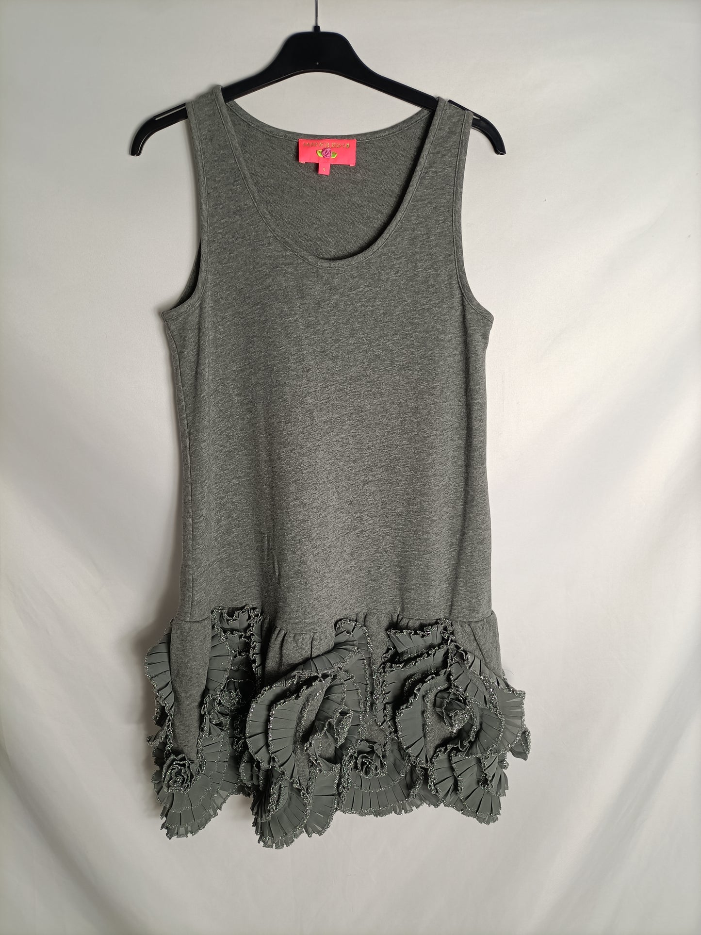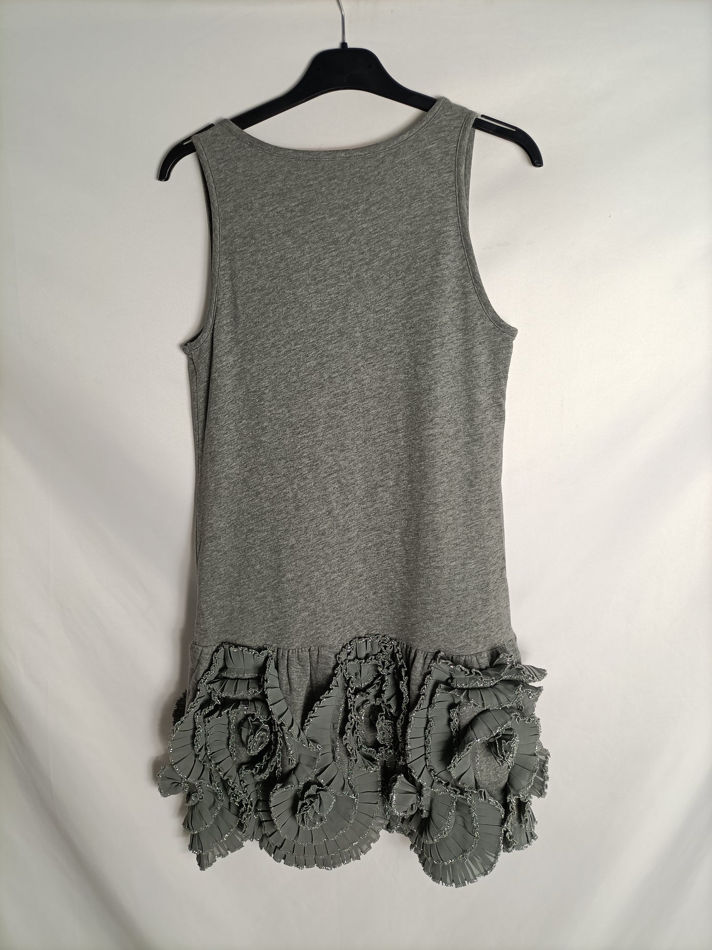 vestido corto gris de tejido elástico con volantes en la parte de abajo con detalle de hilos metálicos.