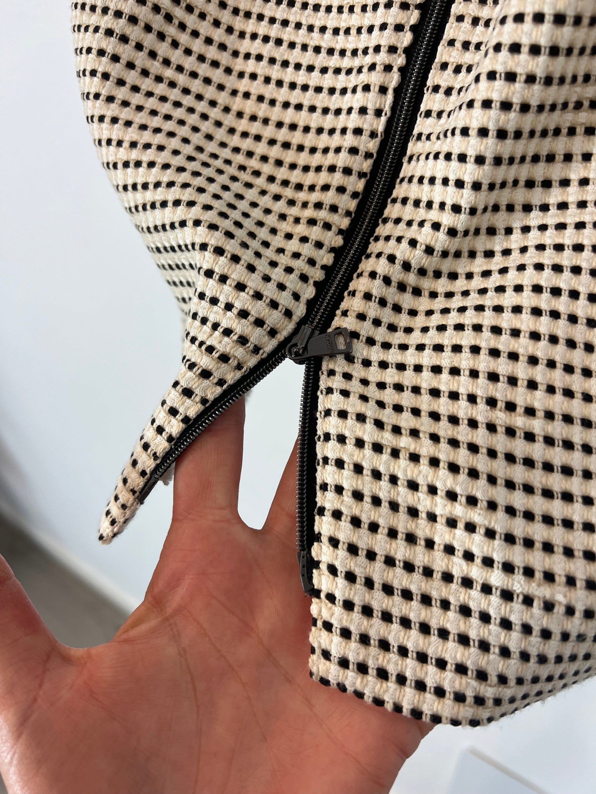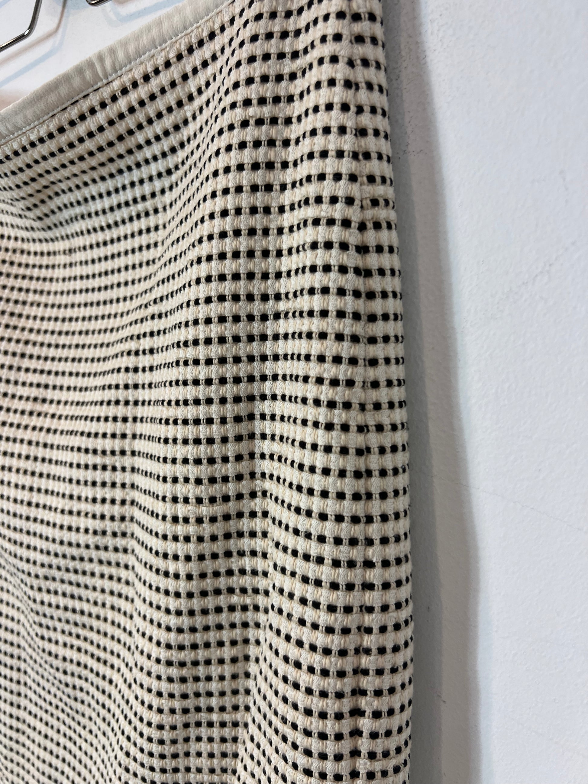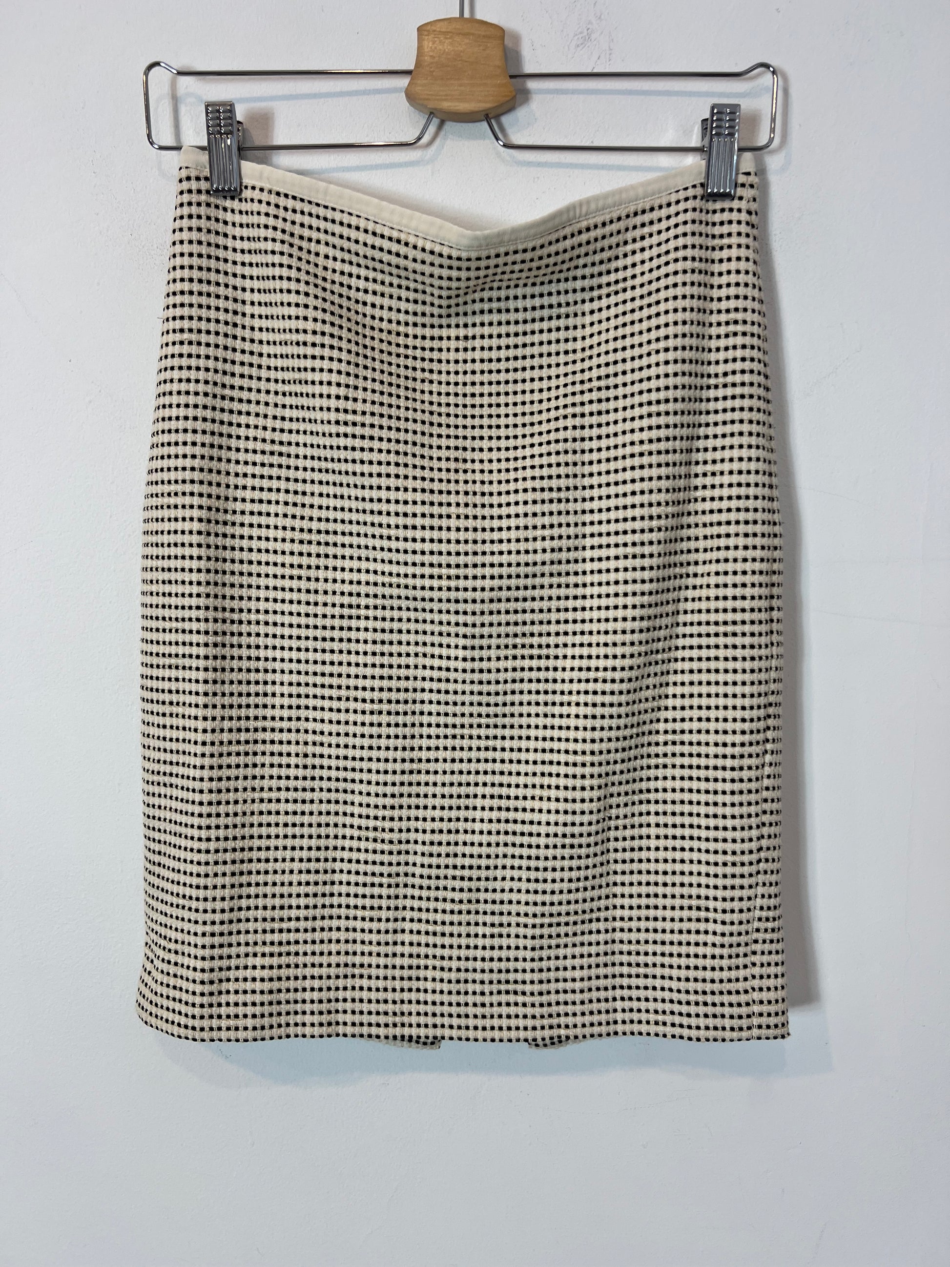 falda corta entallada beige de tejidi con textura y detalles en negro. cintura 37 cm, Largo 51 cm