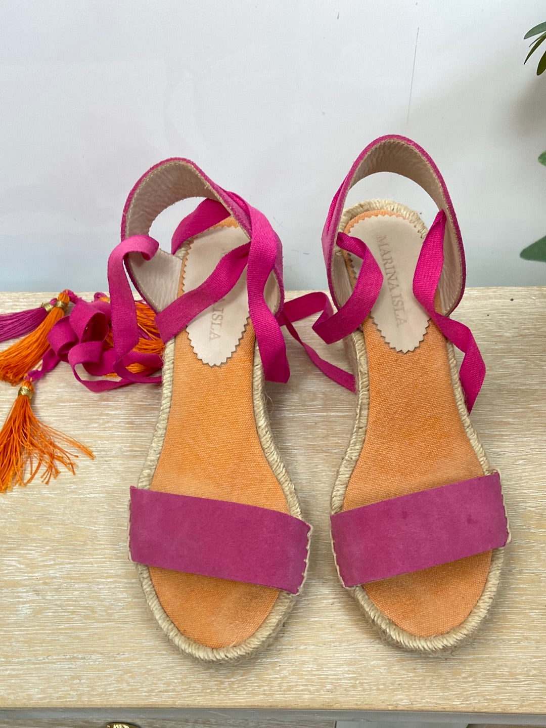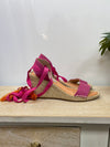 Cuñas rosas fucsia con suela de esparto, se atan con cuerda que acaba en borla. Tacón 8 cm