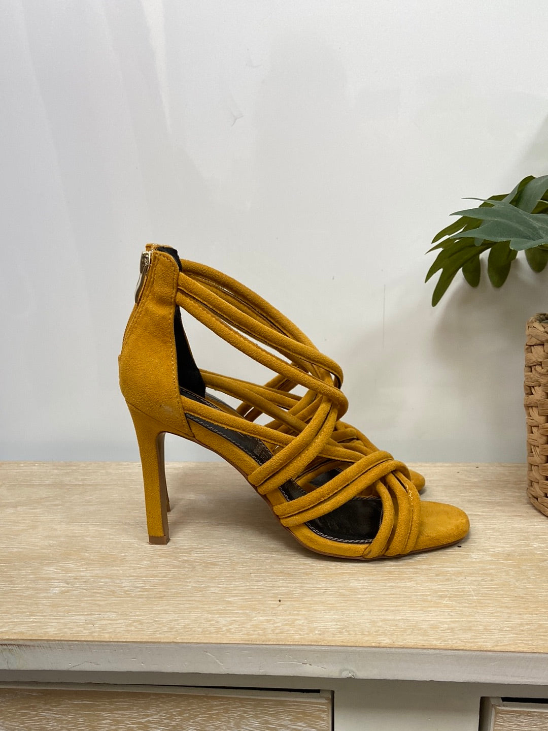 Sandalias amarillas de antelina con tira cruzada se abrocha con cremallera en talón. Tacón 10 cm