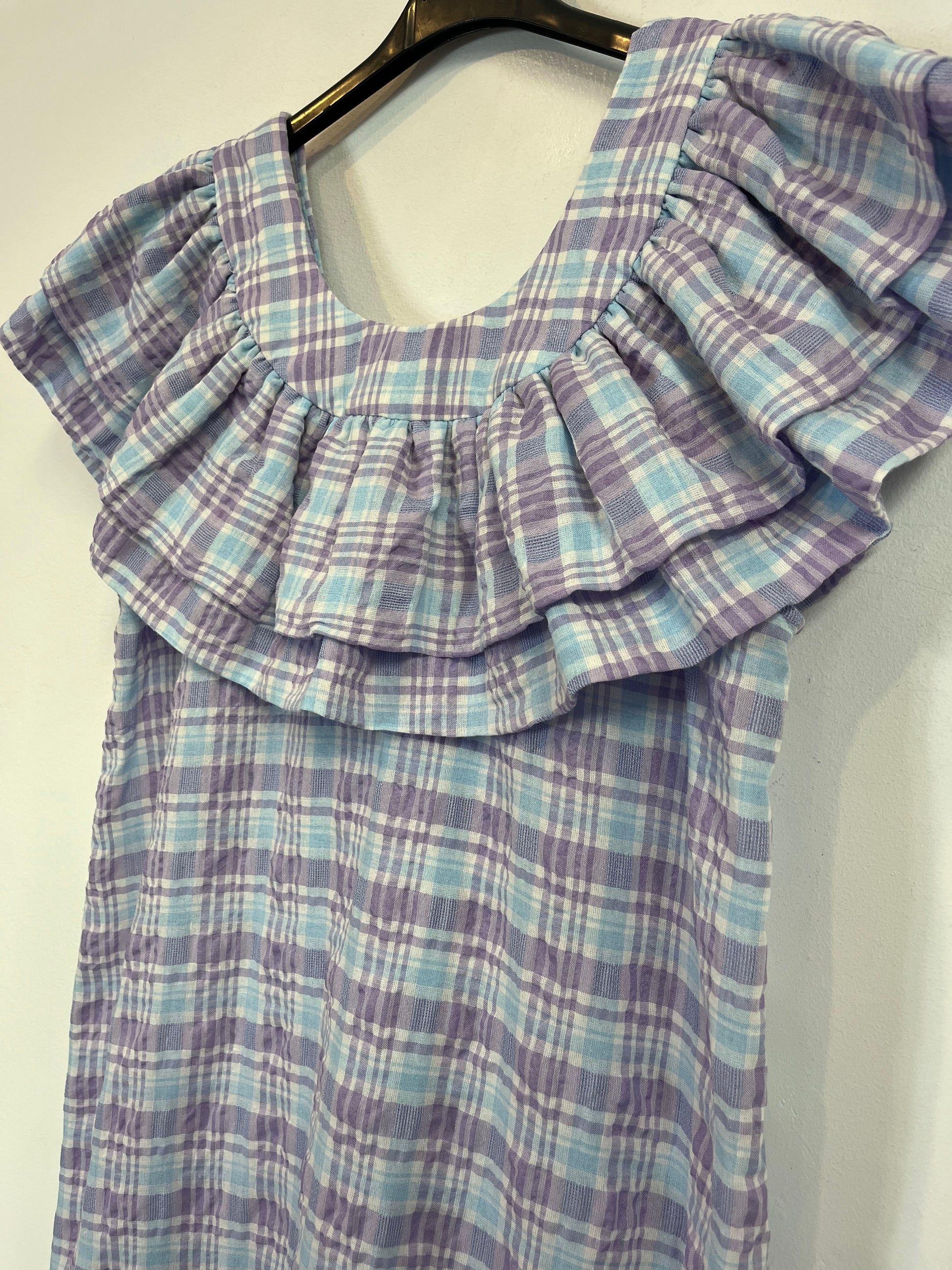 vestido largo de cuadros de tejido contextura. Volante en el escote. Largo 108 cm, de sisa a sisa 47 cm.