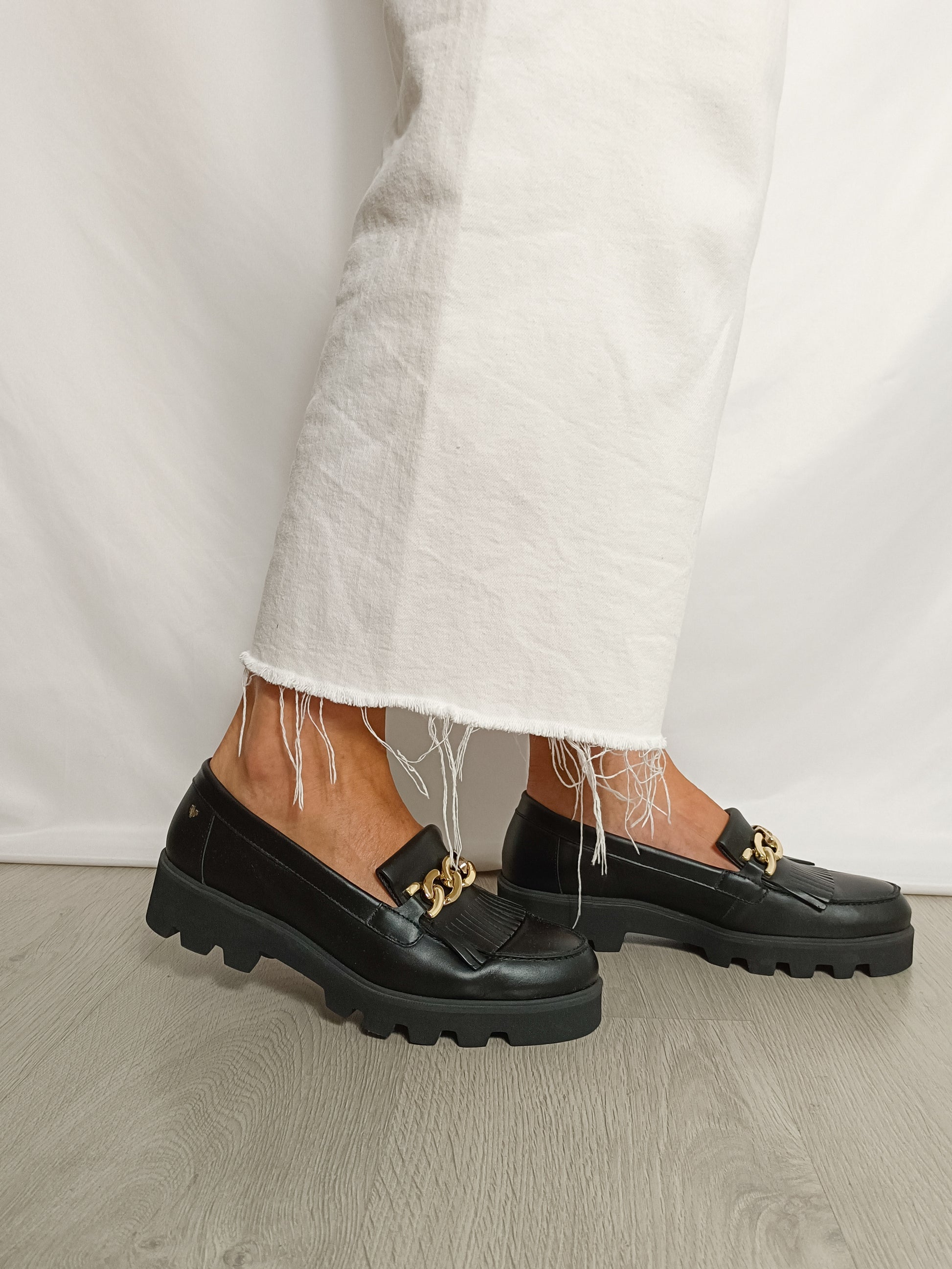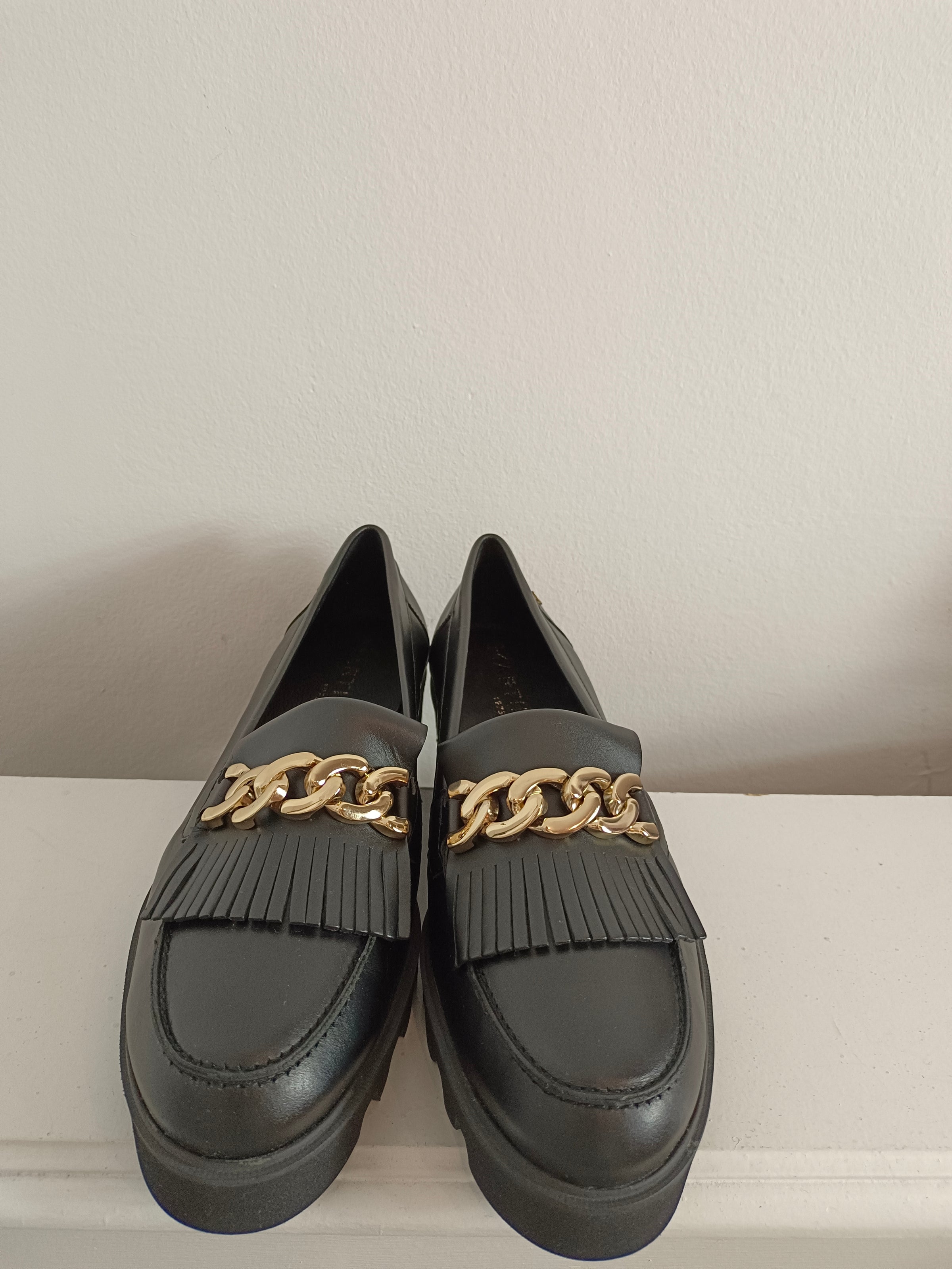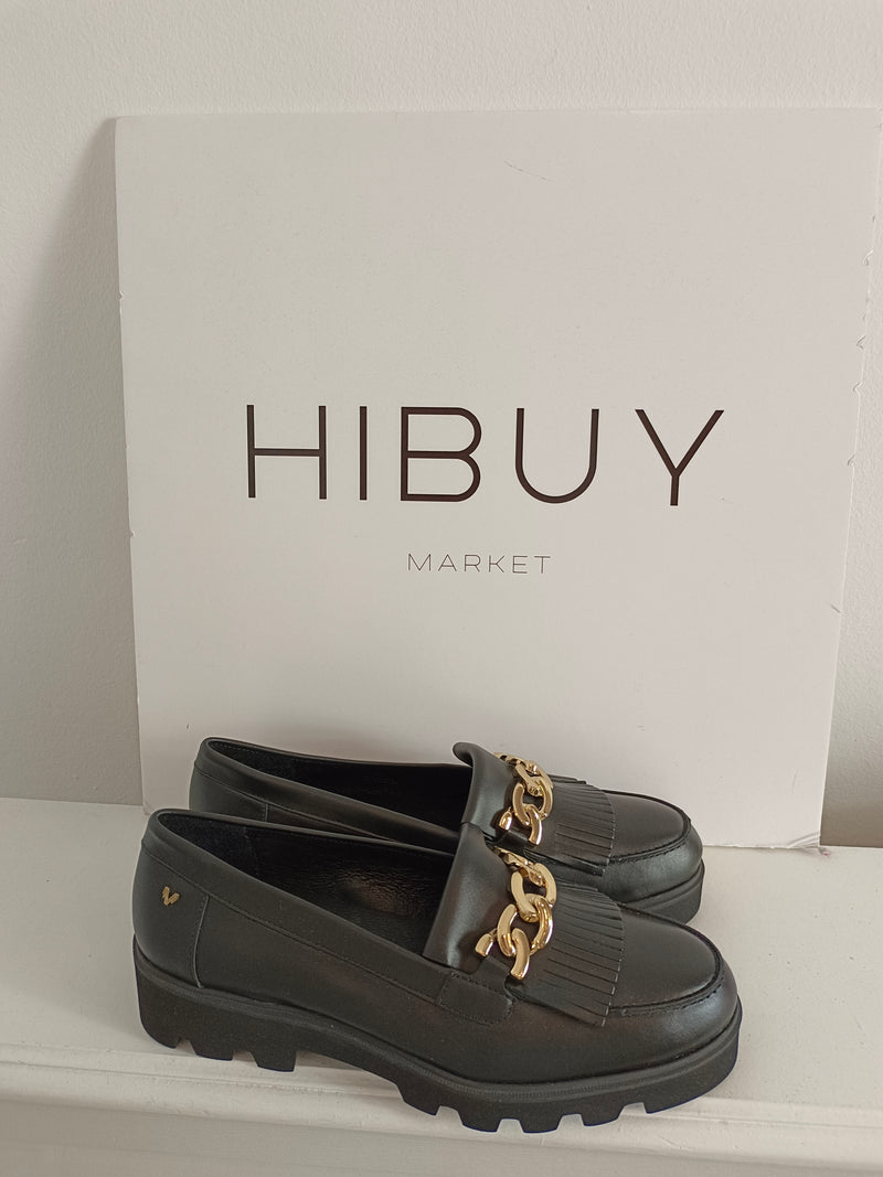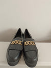 SIN ESTRENAR. Mocasines negros cadena dorada.