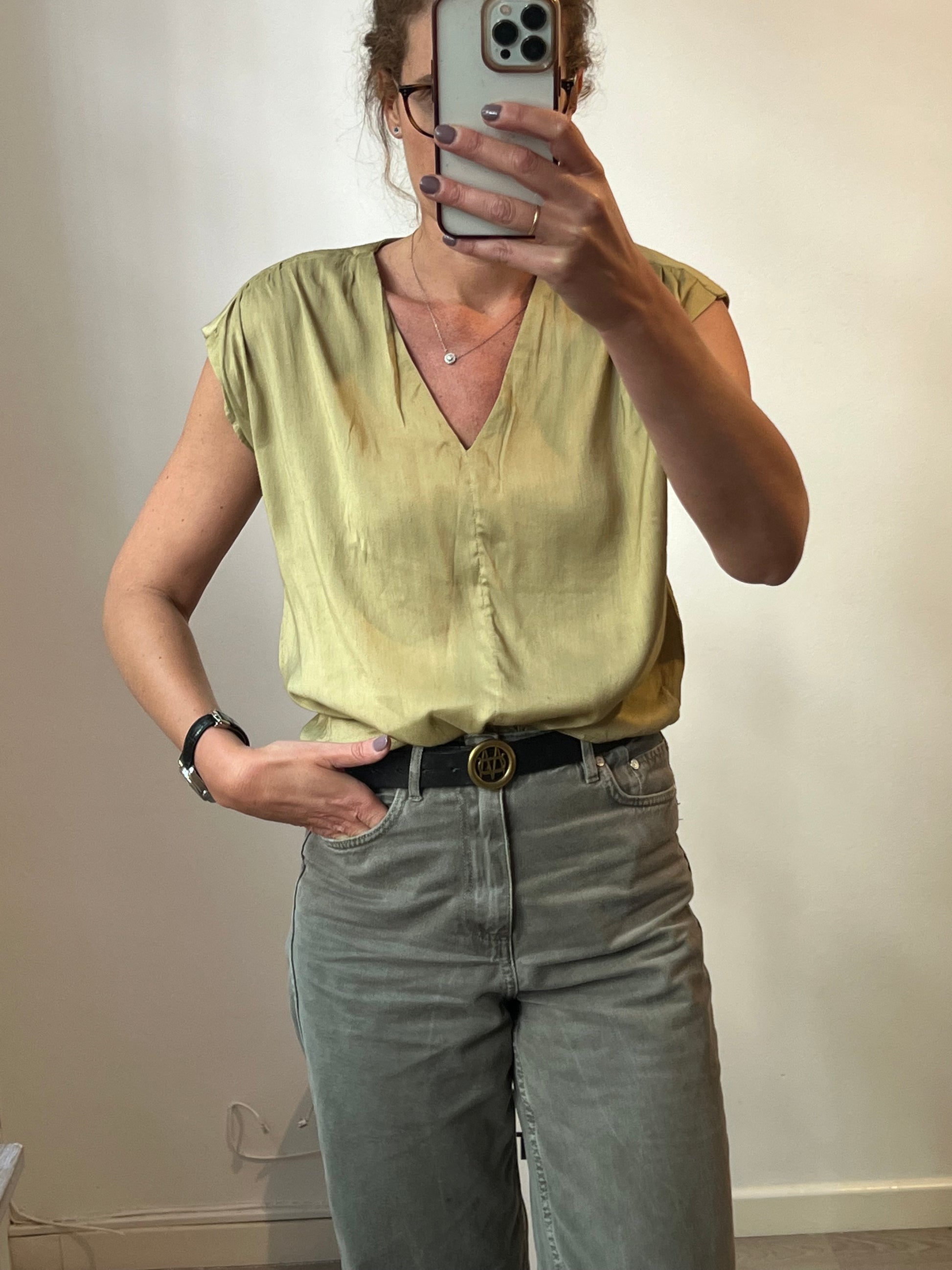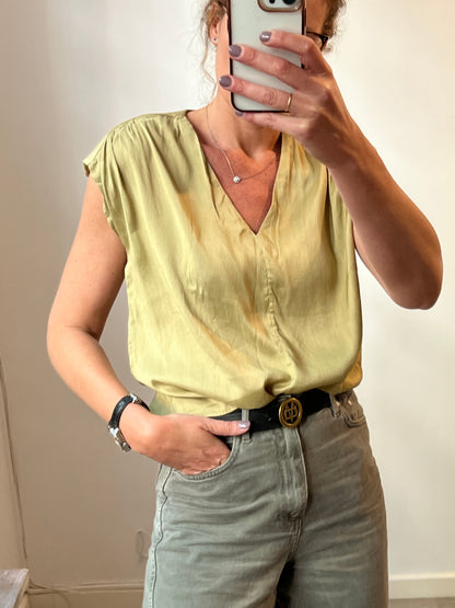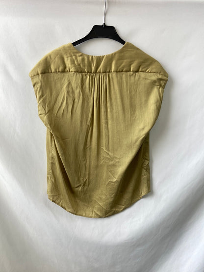 blusa verde tirando a dorado con hombros ligeramente acolchados .