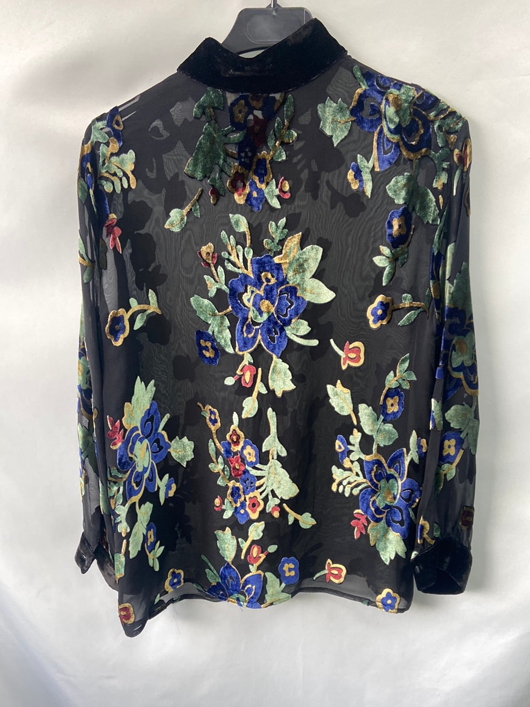 blusa negra semitransparente con bordado en terciopelo. Cuello Perkins con detalle de botones forrados en el hombro.