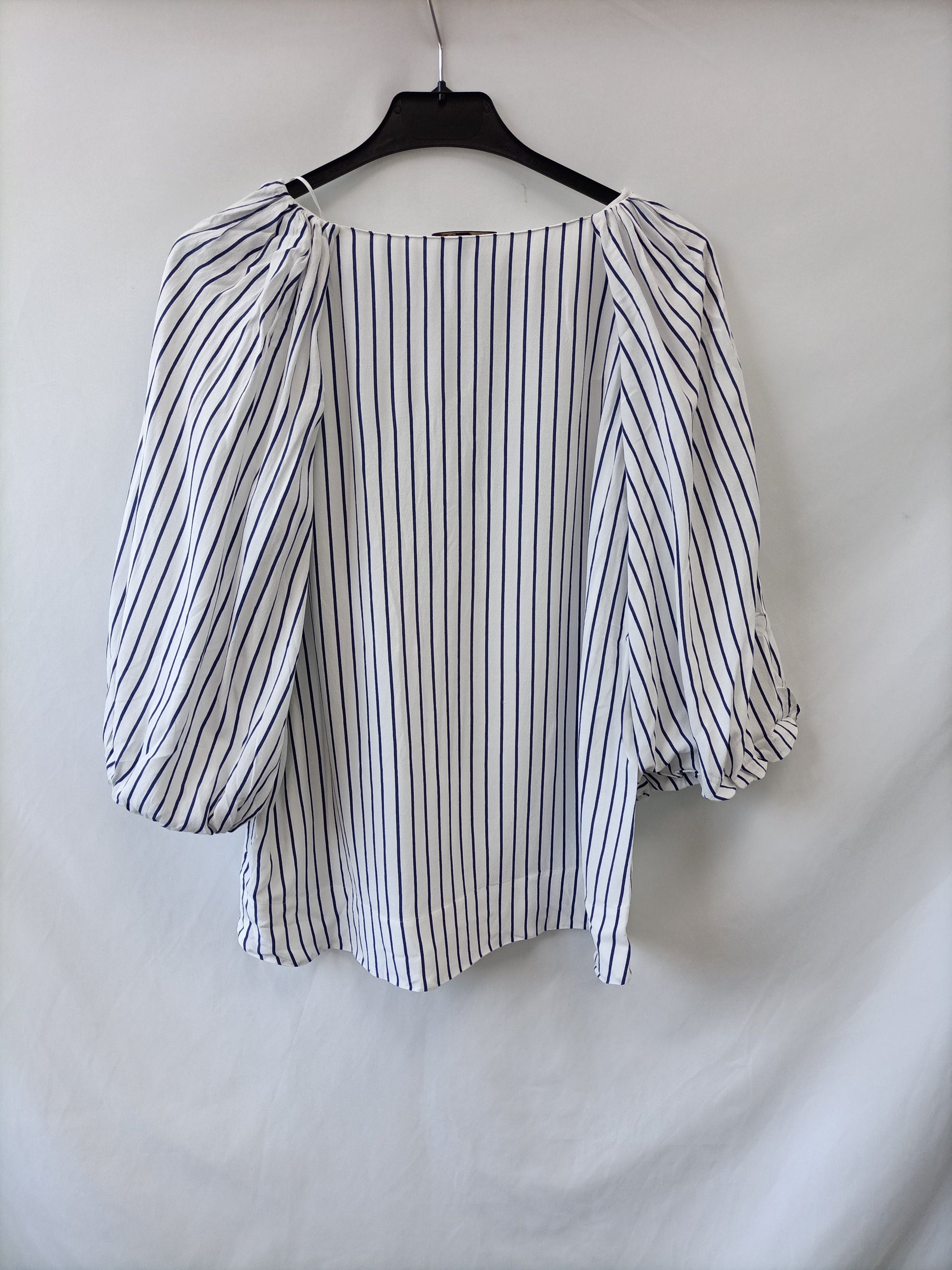 Blusa blanca rayas azul marino mangas abullonadas. De sisa a sisa 45 cm largo 60 cm