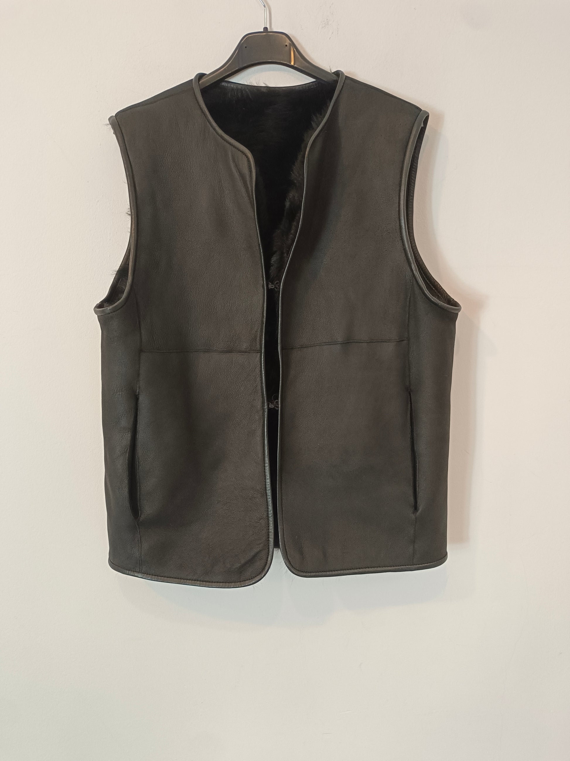 Chaleco de pelo y piel negro. No tiene etiqueta interior. De sisa a sisa 52 cm largo 60 cm
