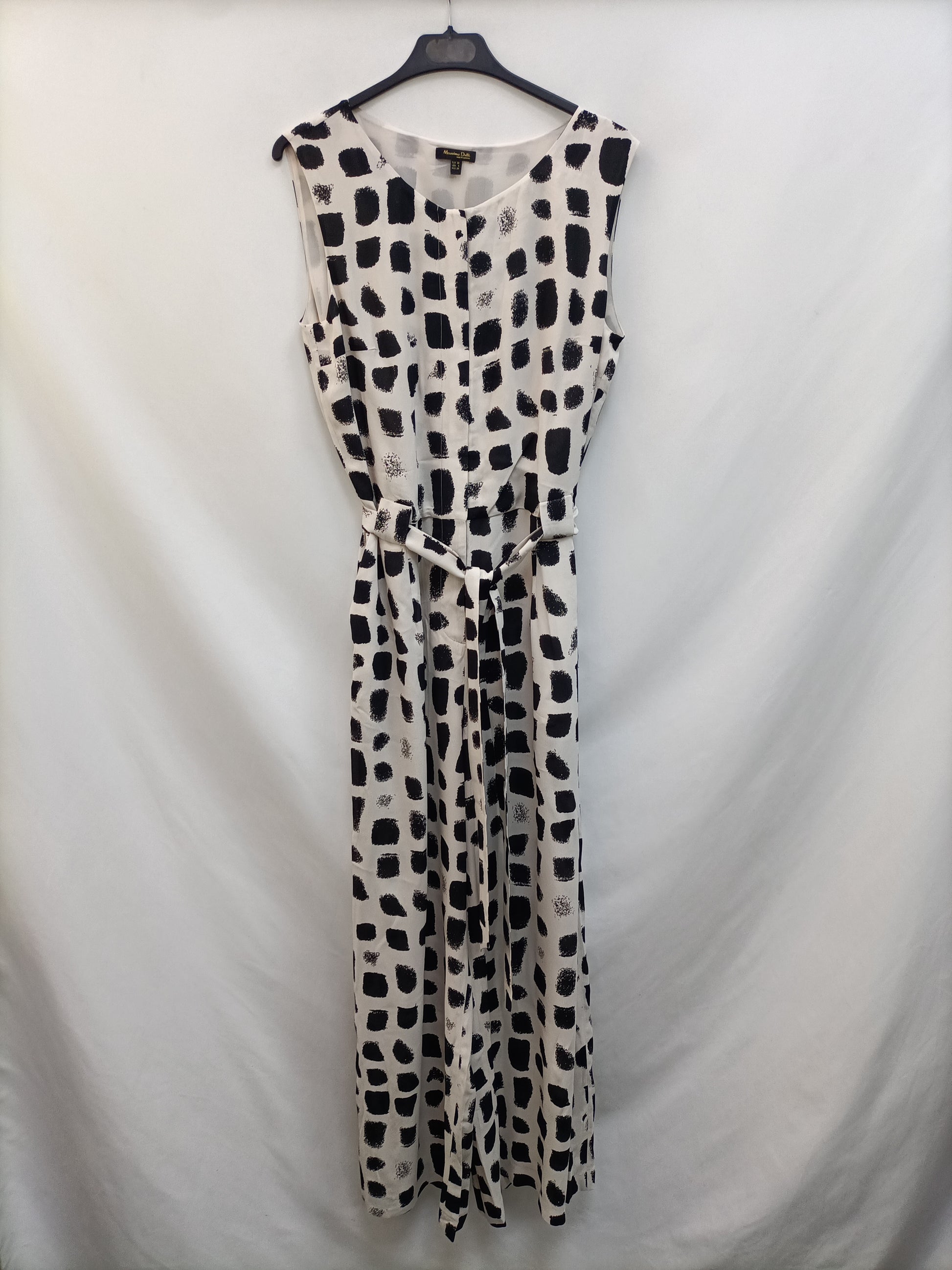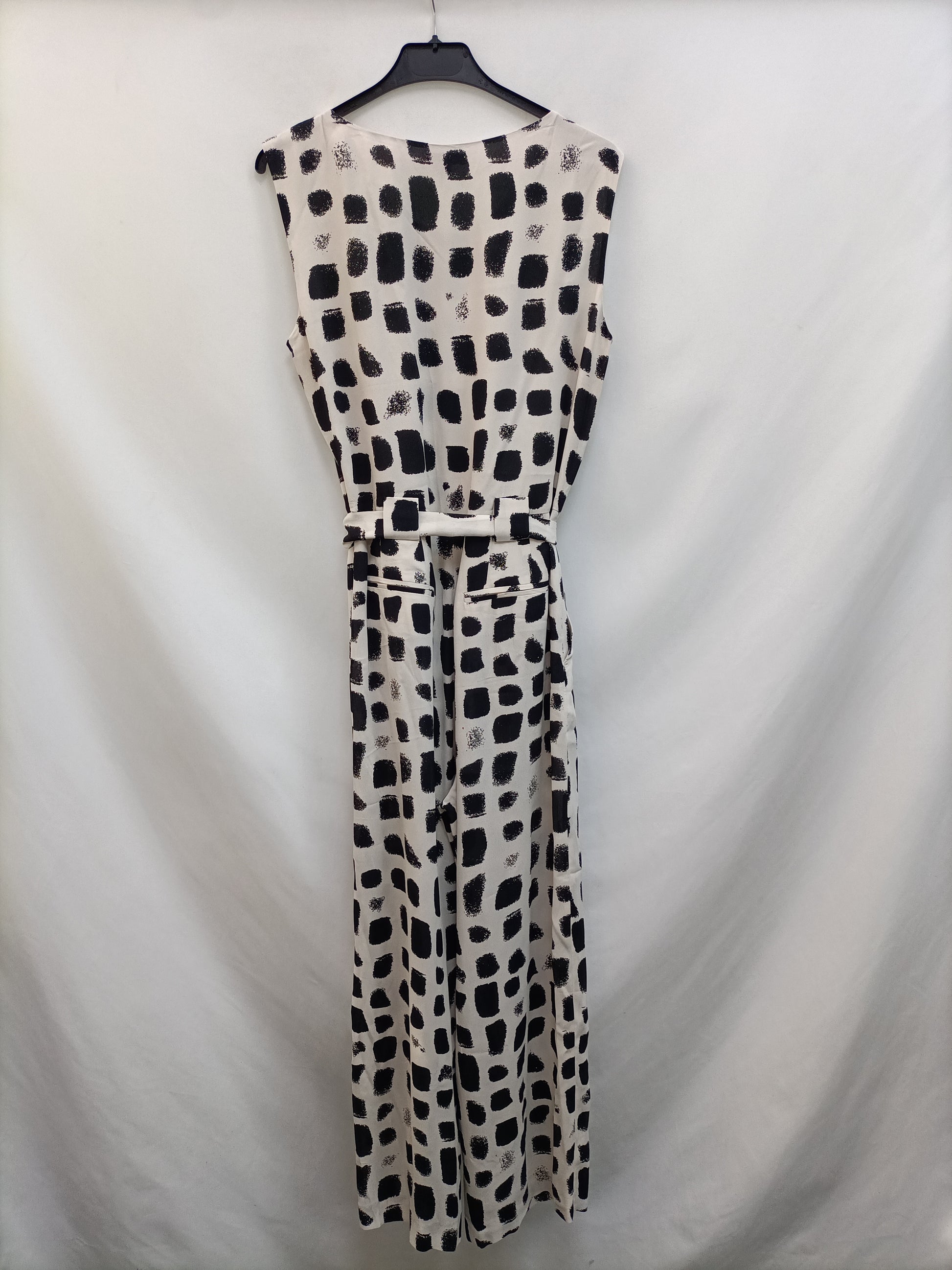 Mono fluido beige con estampado de cuadros. cinturón de lazada. de sisa a sisa 49 cm largo 138 cm