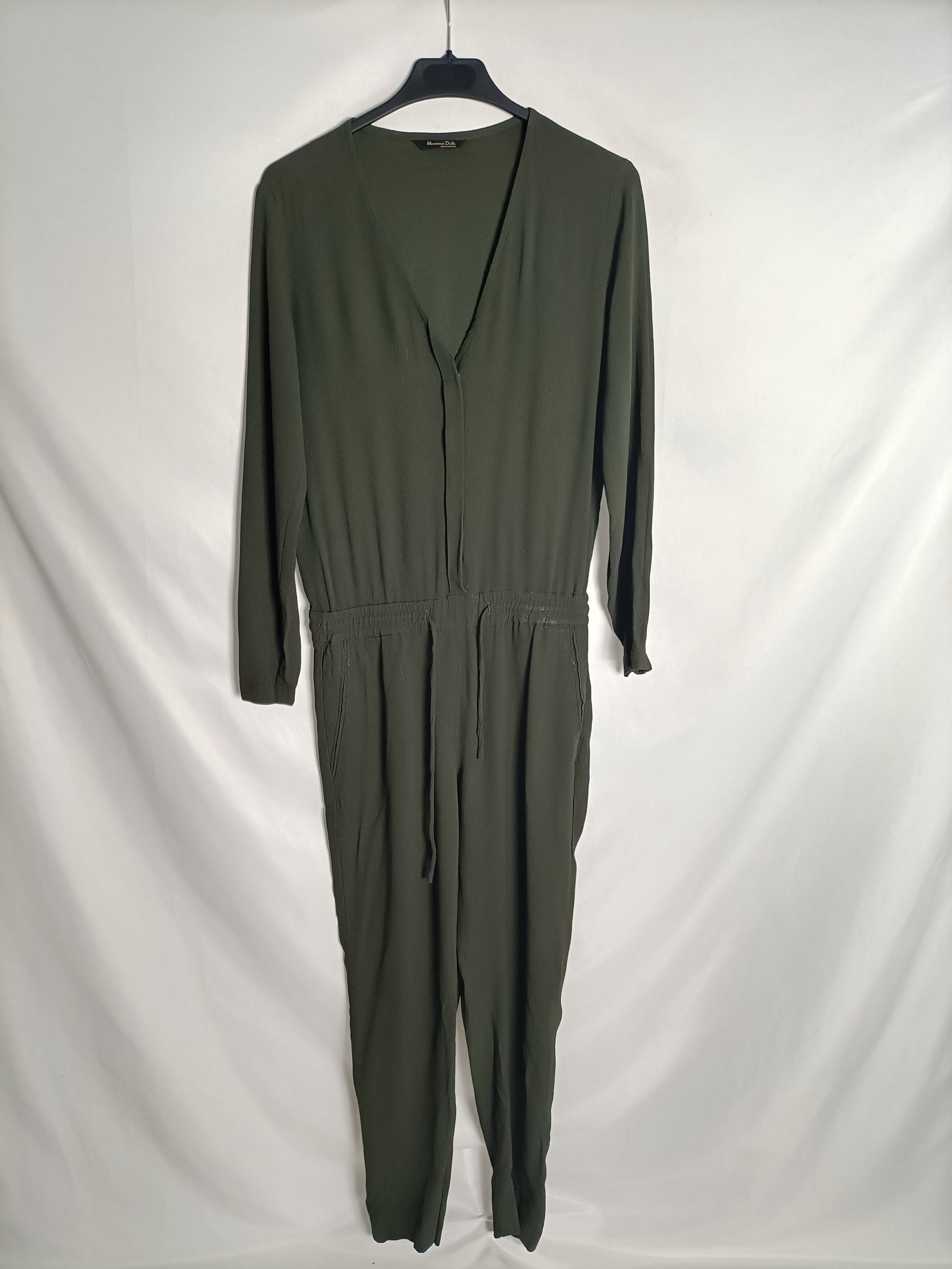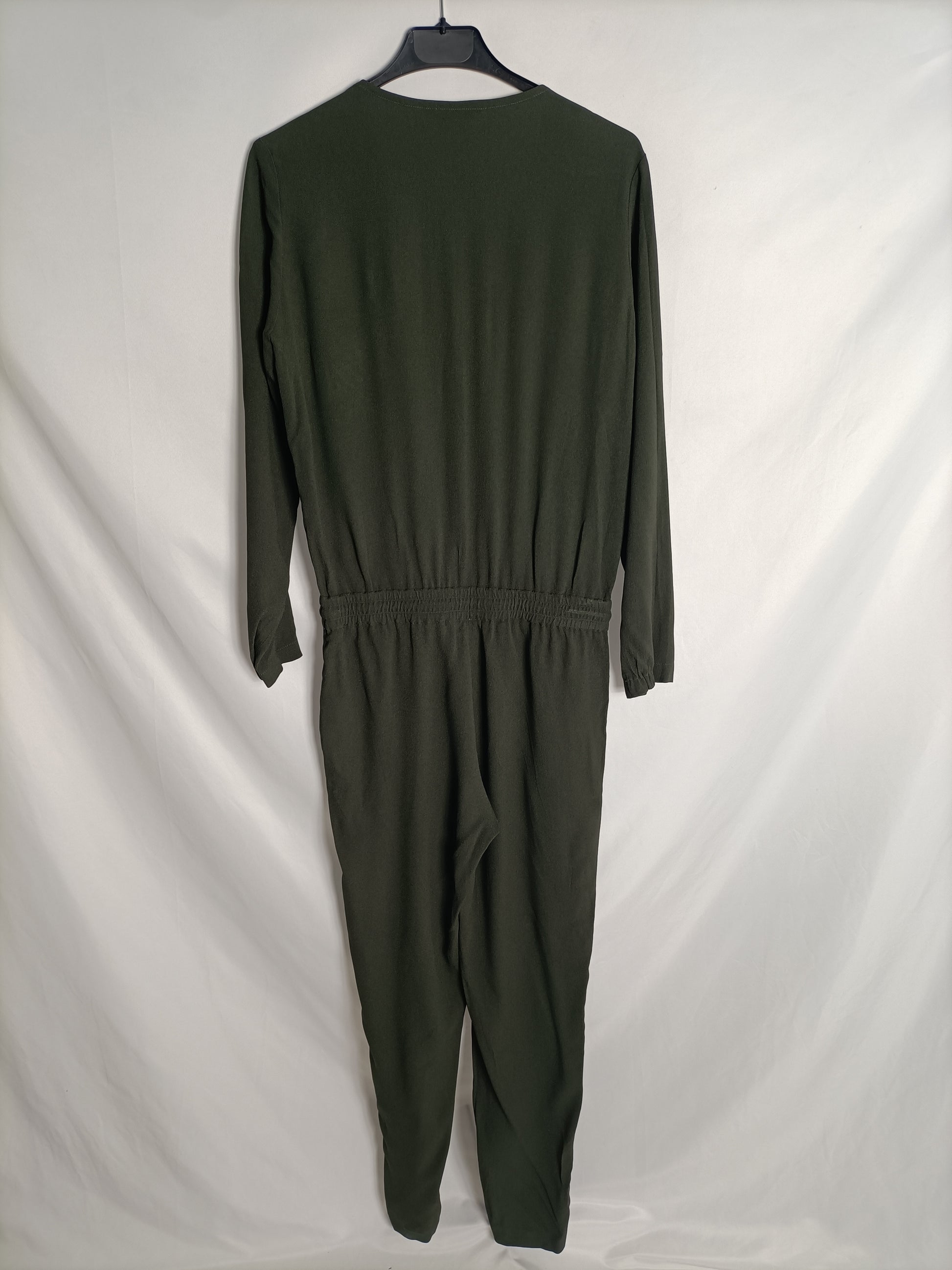 Mono verde fluido con escote abotonado y detalle de cintura ajustable