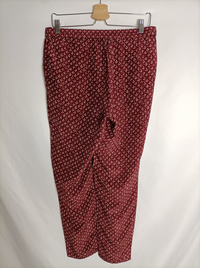 Pantalón fluido y fino burdeos con estampado de amebas. cintura elástica ajustable