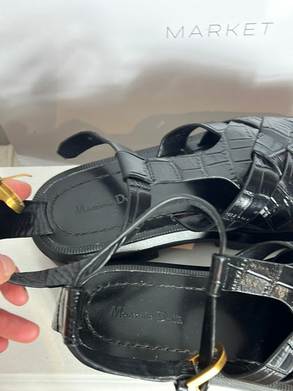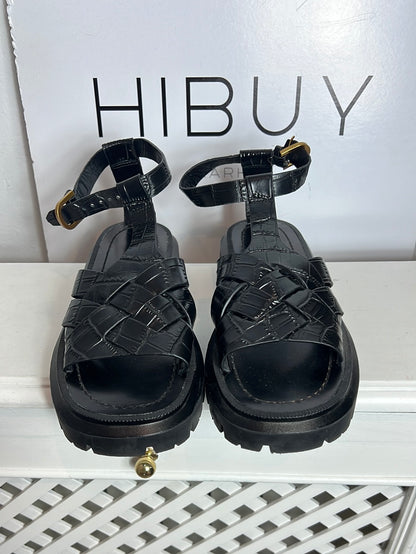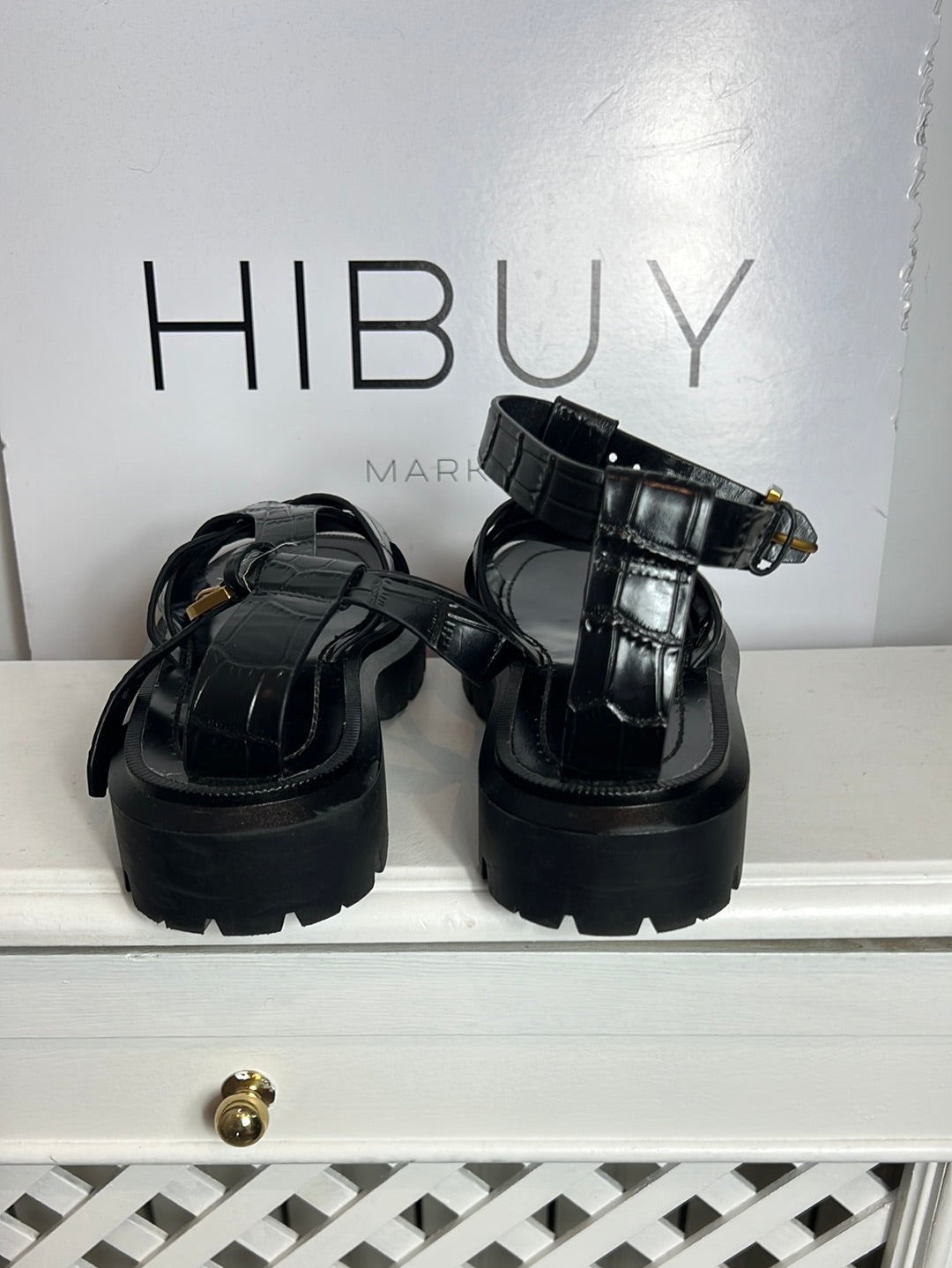 NUEVAS SIN USO. Sandalia tiras plataforma plana piel troquelada en negro