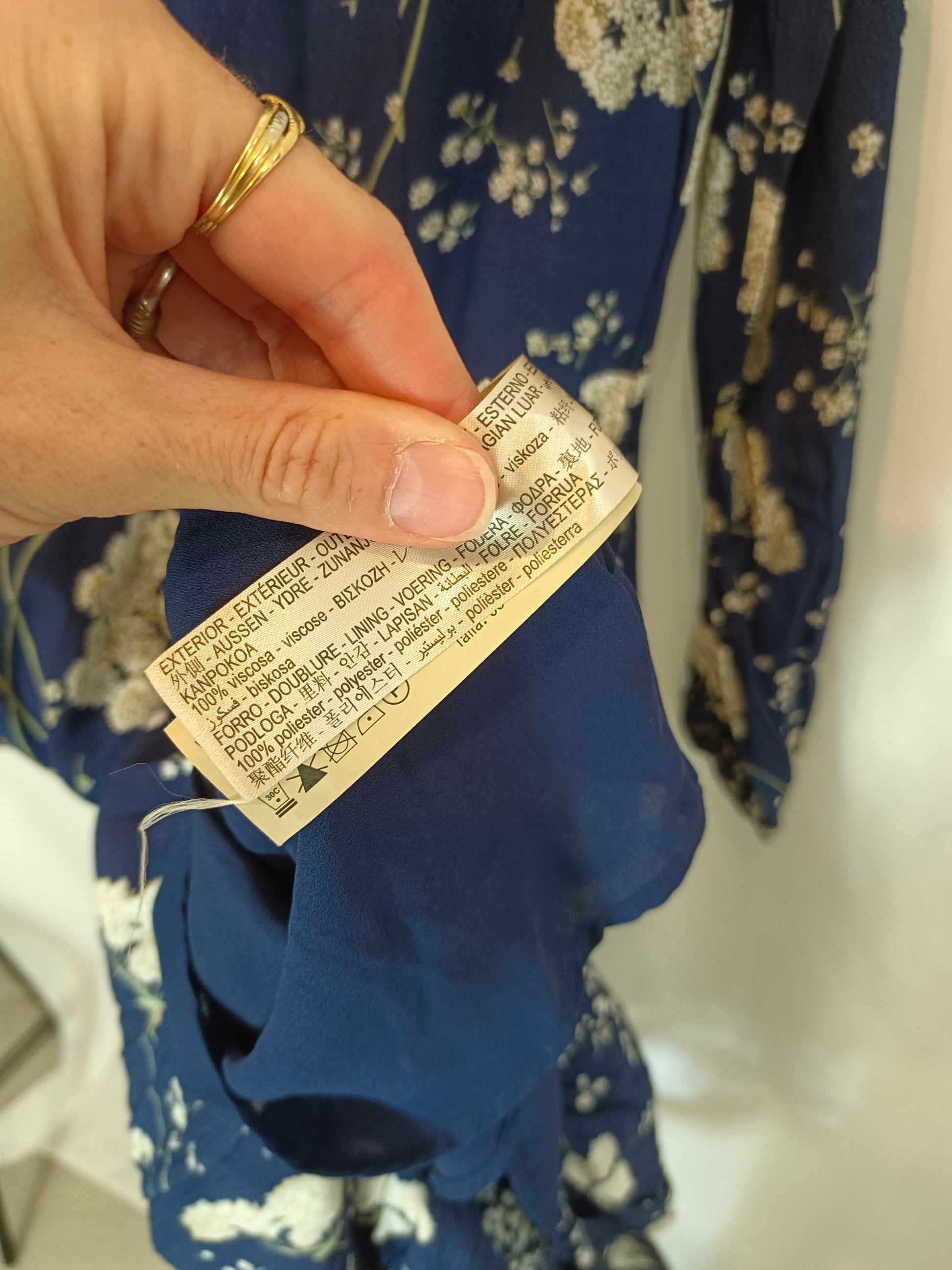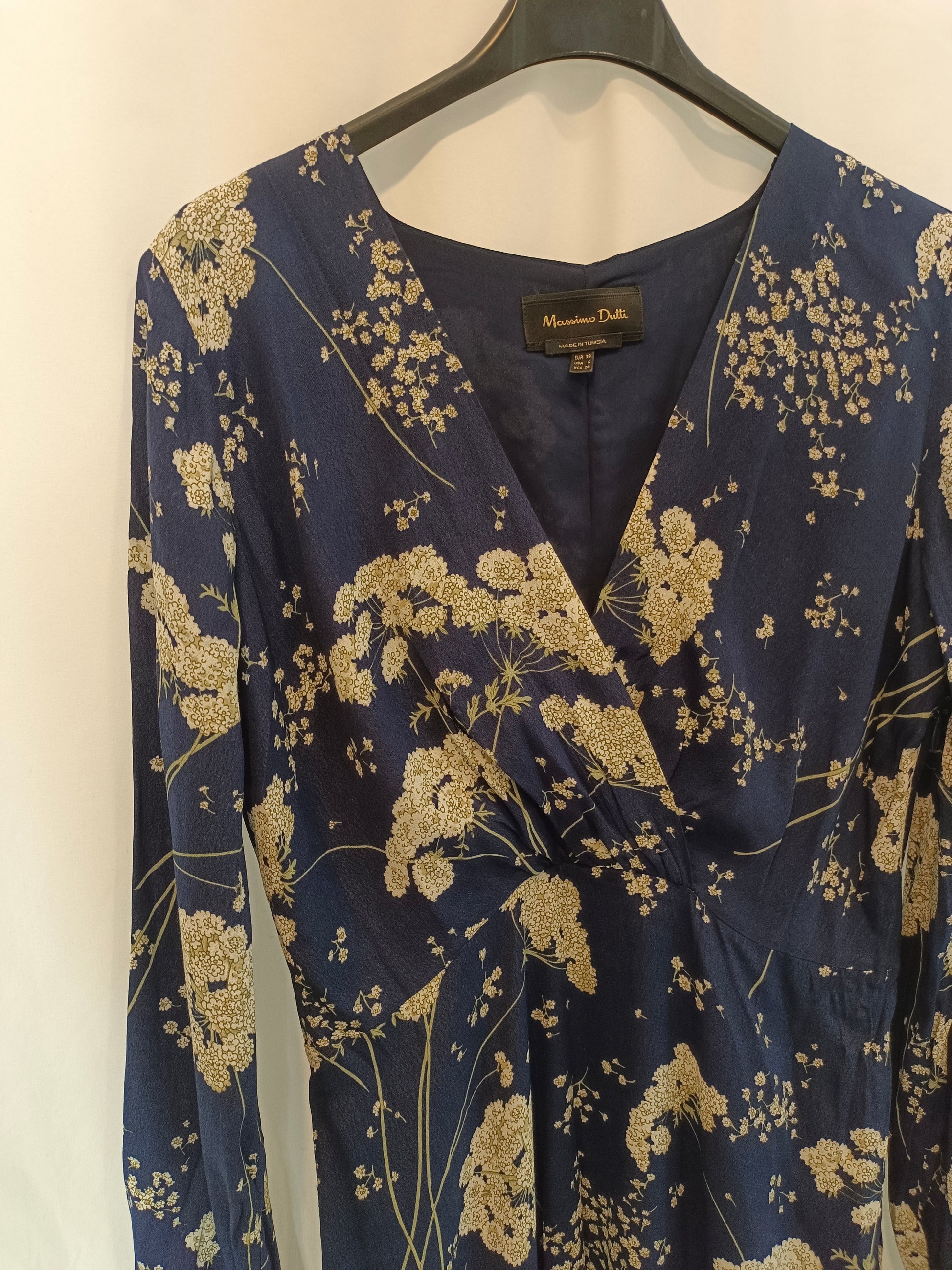 Vestido largo azul con flores en tonos beige. Detalle e volante en la parte de abajo