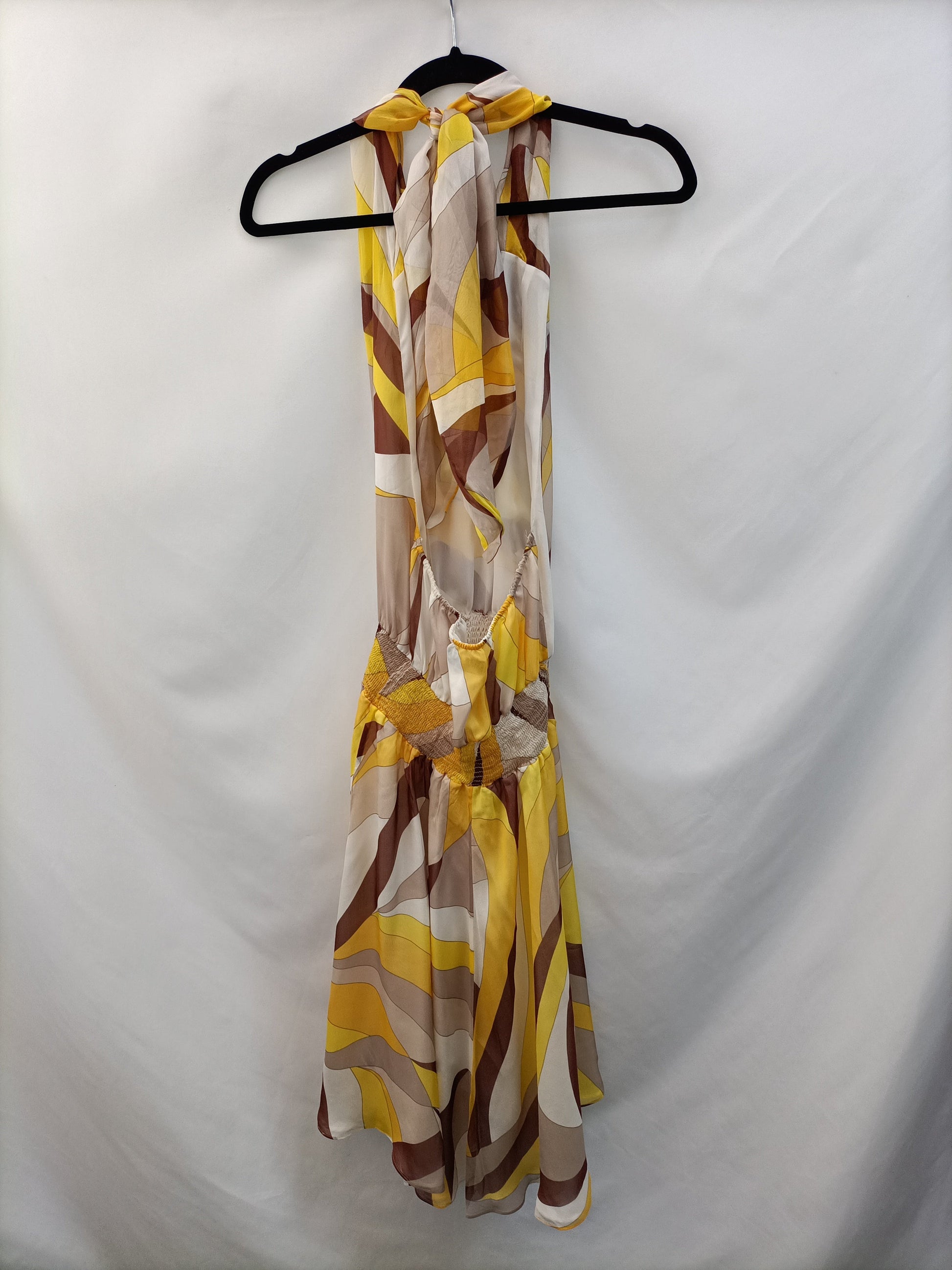 Vestido de seda estampado en tonos tierra. Atado al cuello con la espalda al aire. Cintura elástica. largo 90 cm