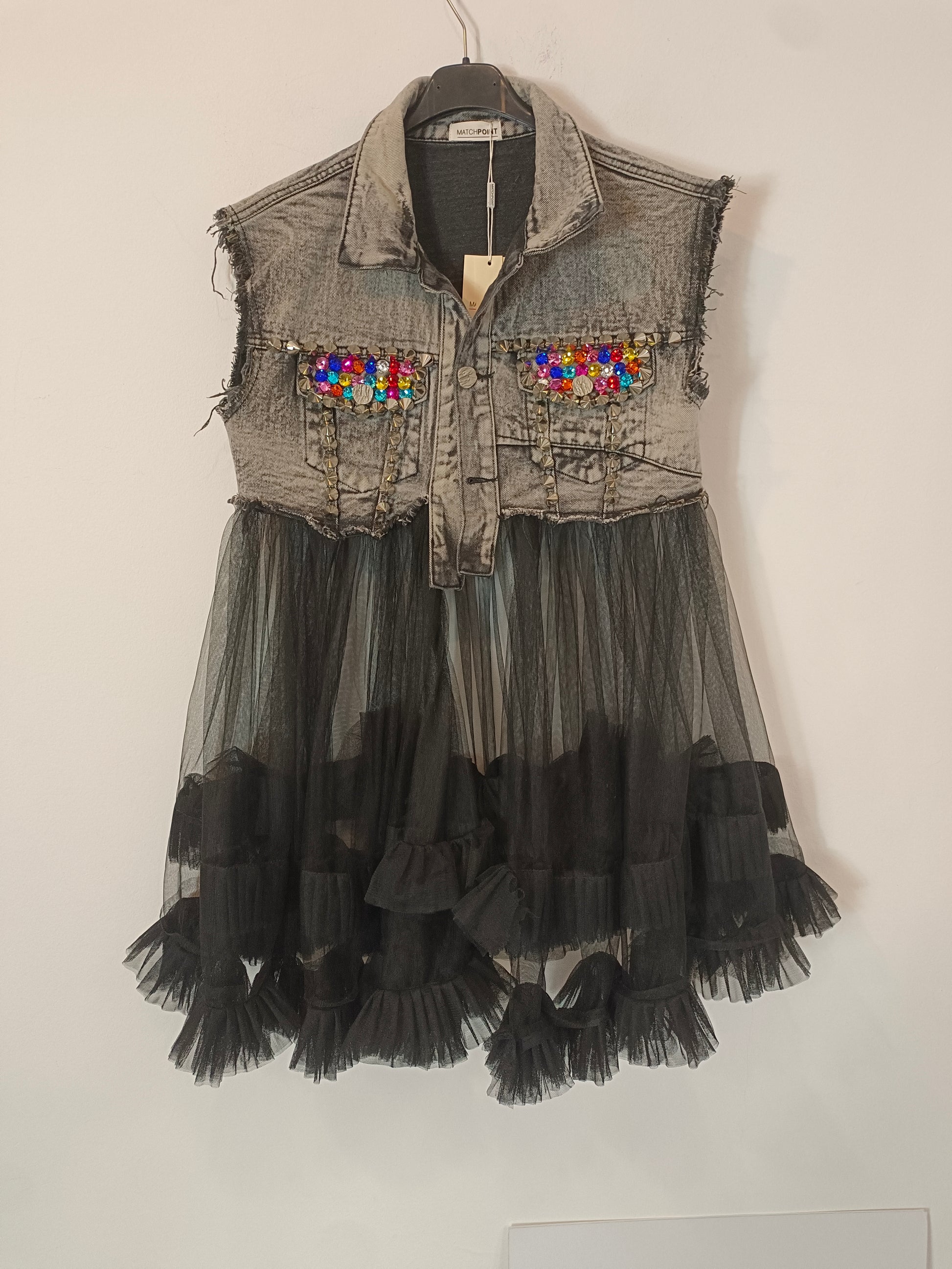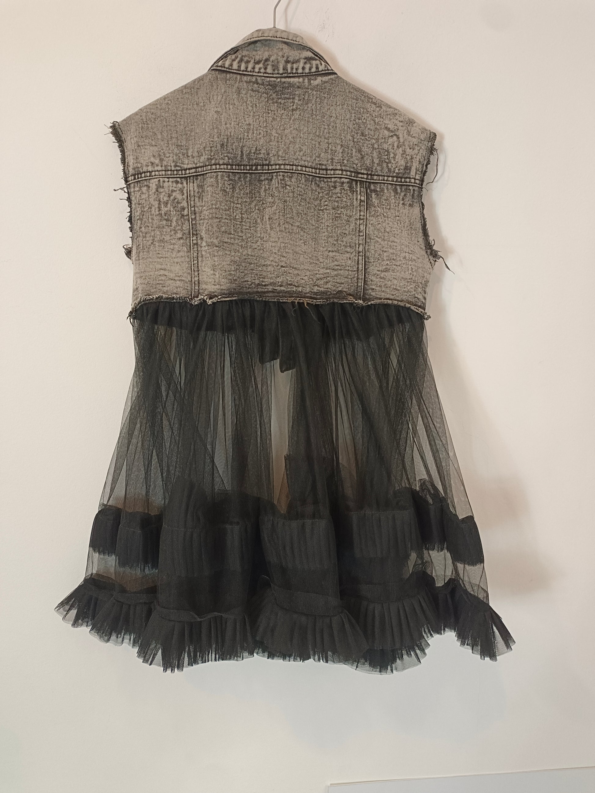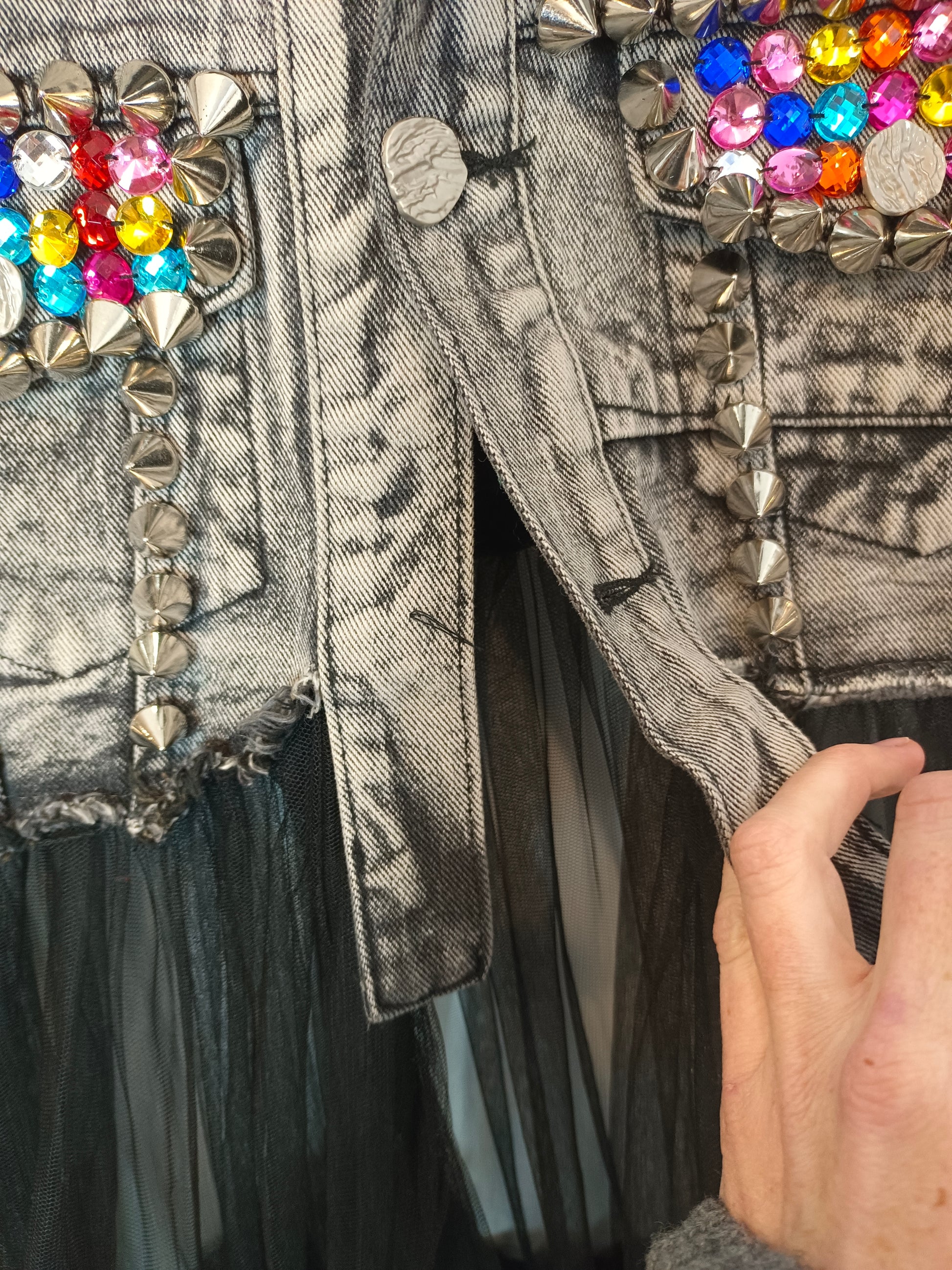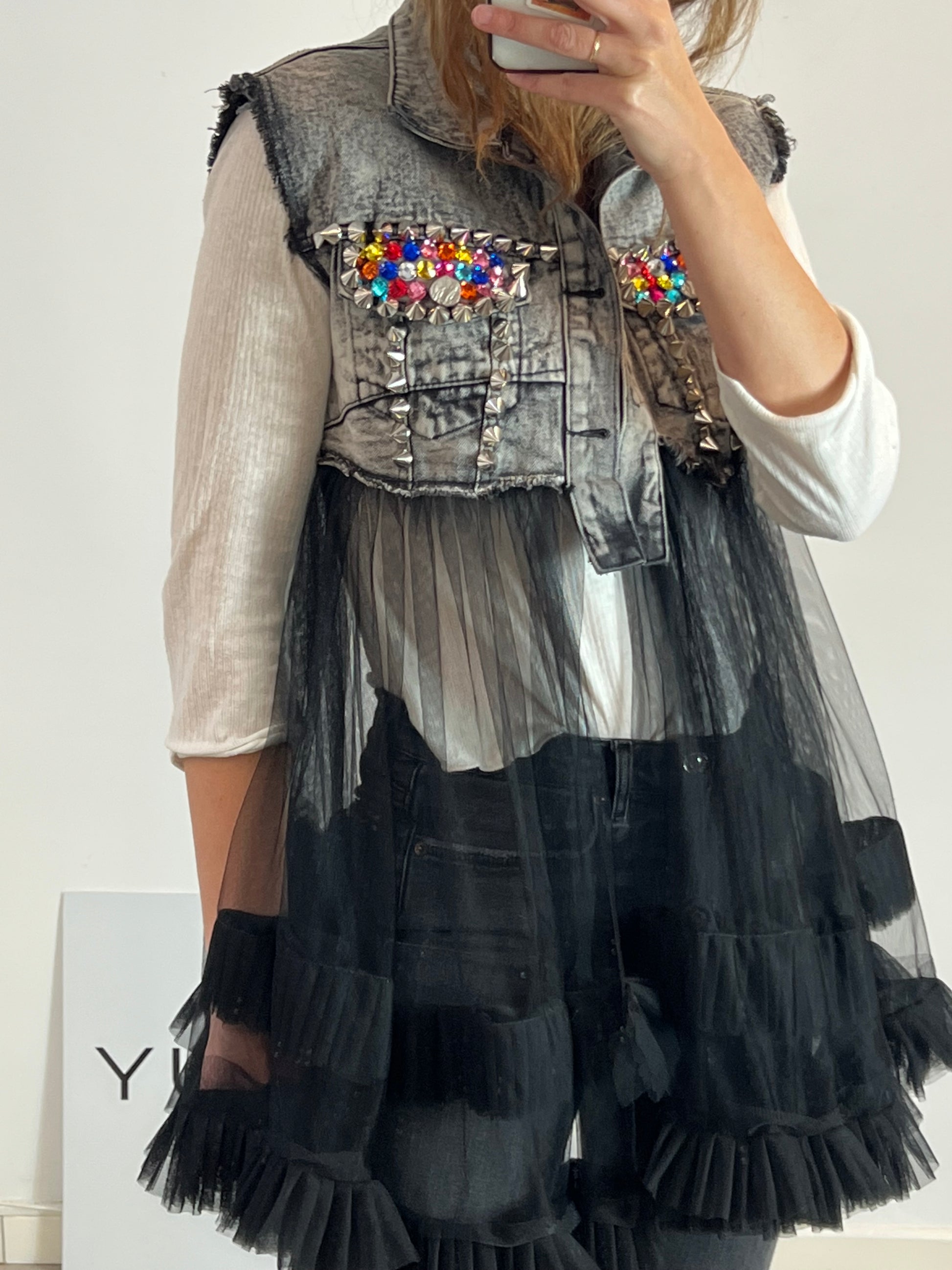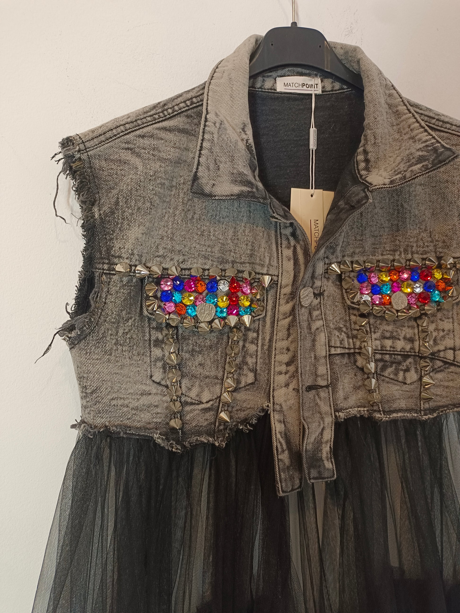 NUEVO CON ETIQUETA. Chaqueta larga denim gris con parte de abajo el tull negro. Pedrería y pinchos. Falta un botón