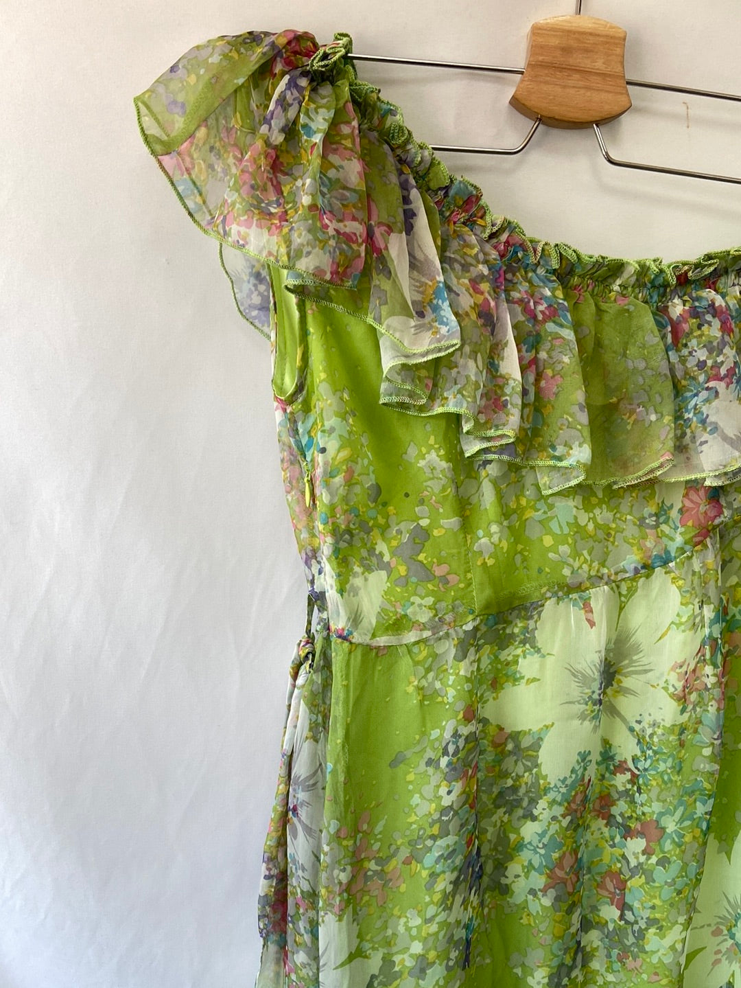 Vestido verde asimétrico. Con volante en el escote. Fluido, con lazada de cinturón. Largo 86 cm