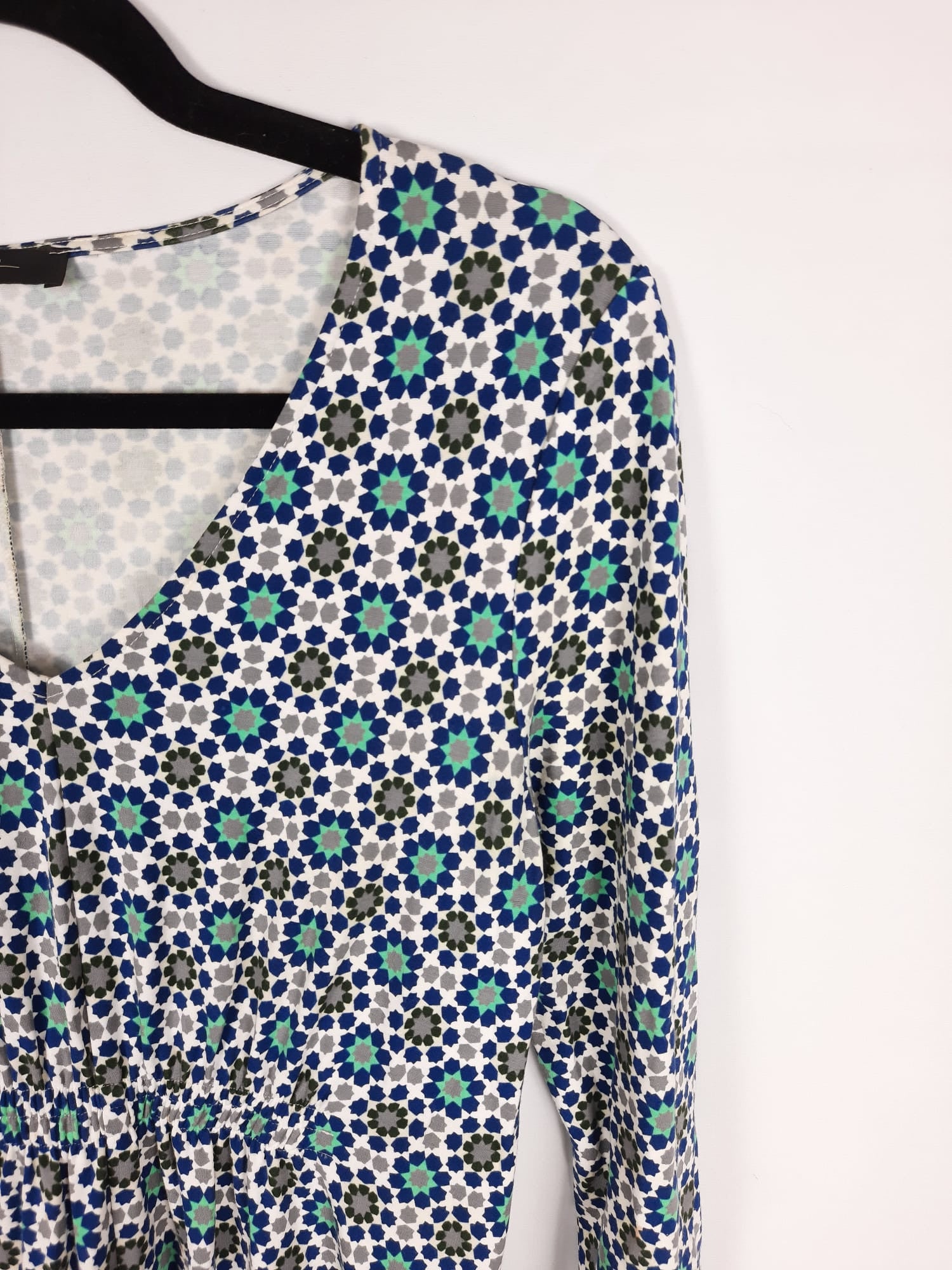 Max mara. Vestido mido elástico con estampado tipo azulejo. Pequeño fruncido debajo del pecho y espalda. Largo 113 cm