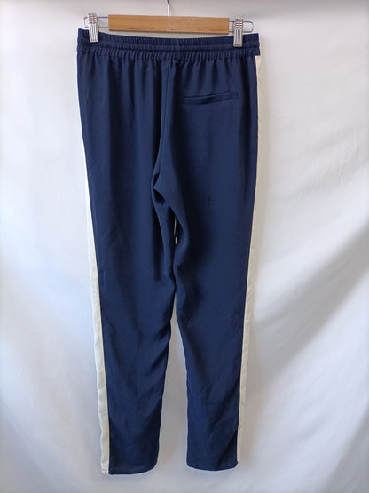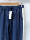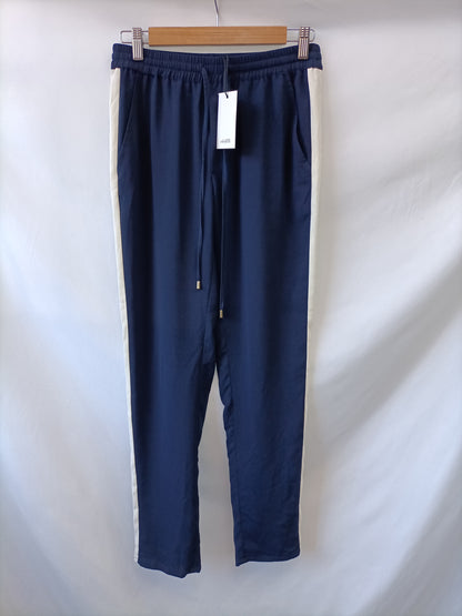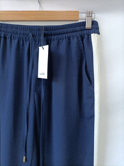 NUEVO CON ETIQUETA. pantalón azul fluido con raya lateral beige. Cintura elástica. Largo 105 cm