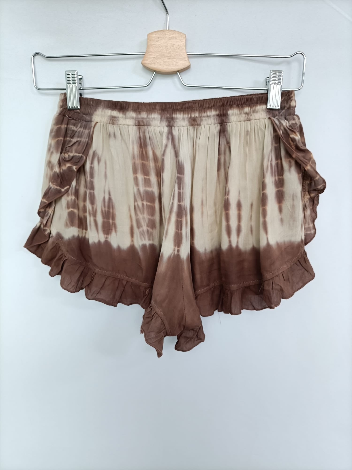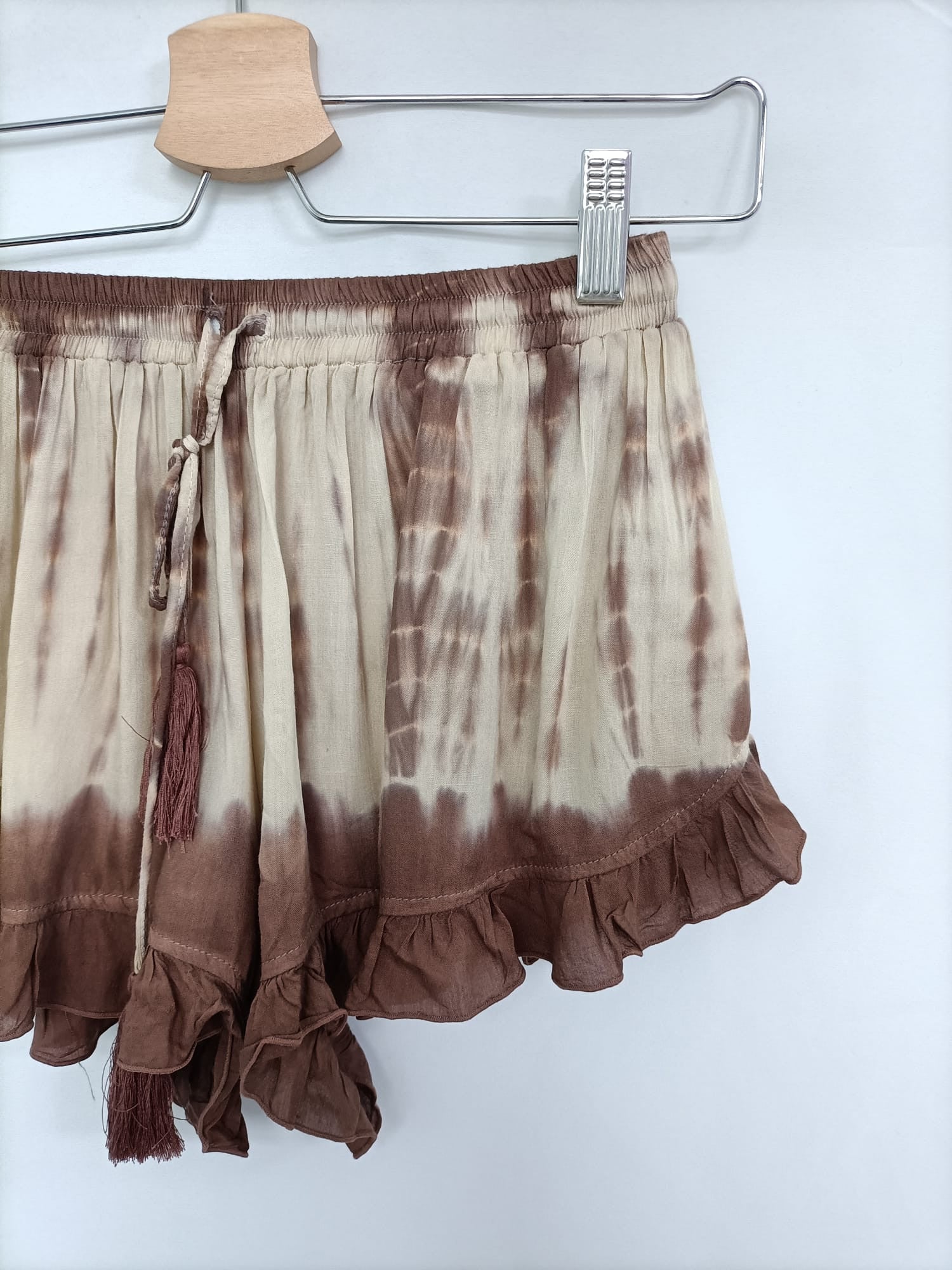Melé beach. Tu (s). Short tie dye marrón y beige con mini volante. Cintura elástica. Largo 29 cm