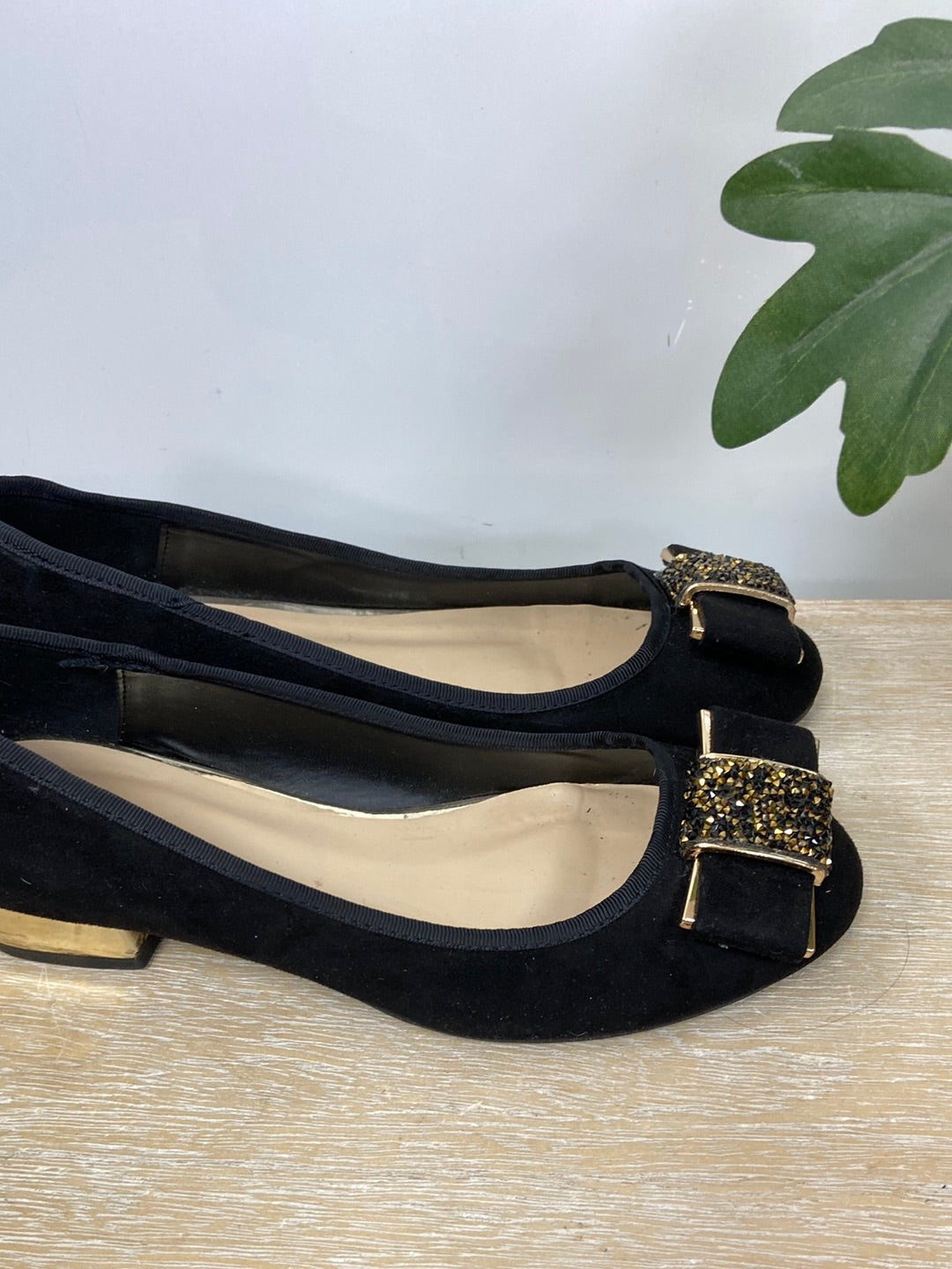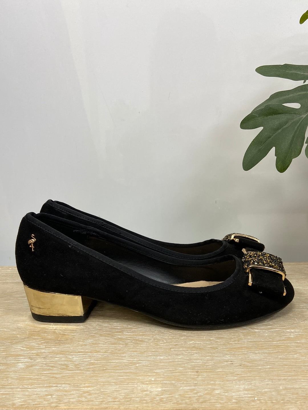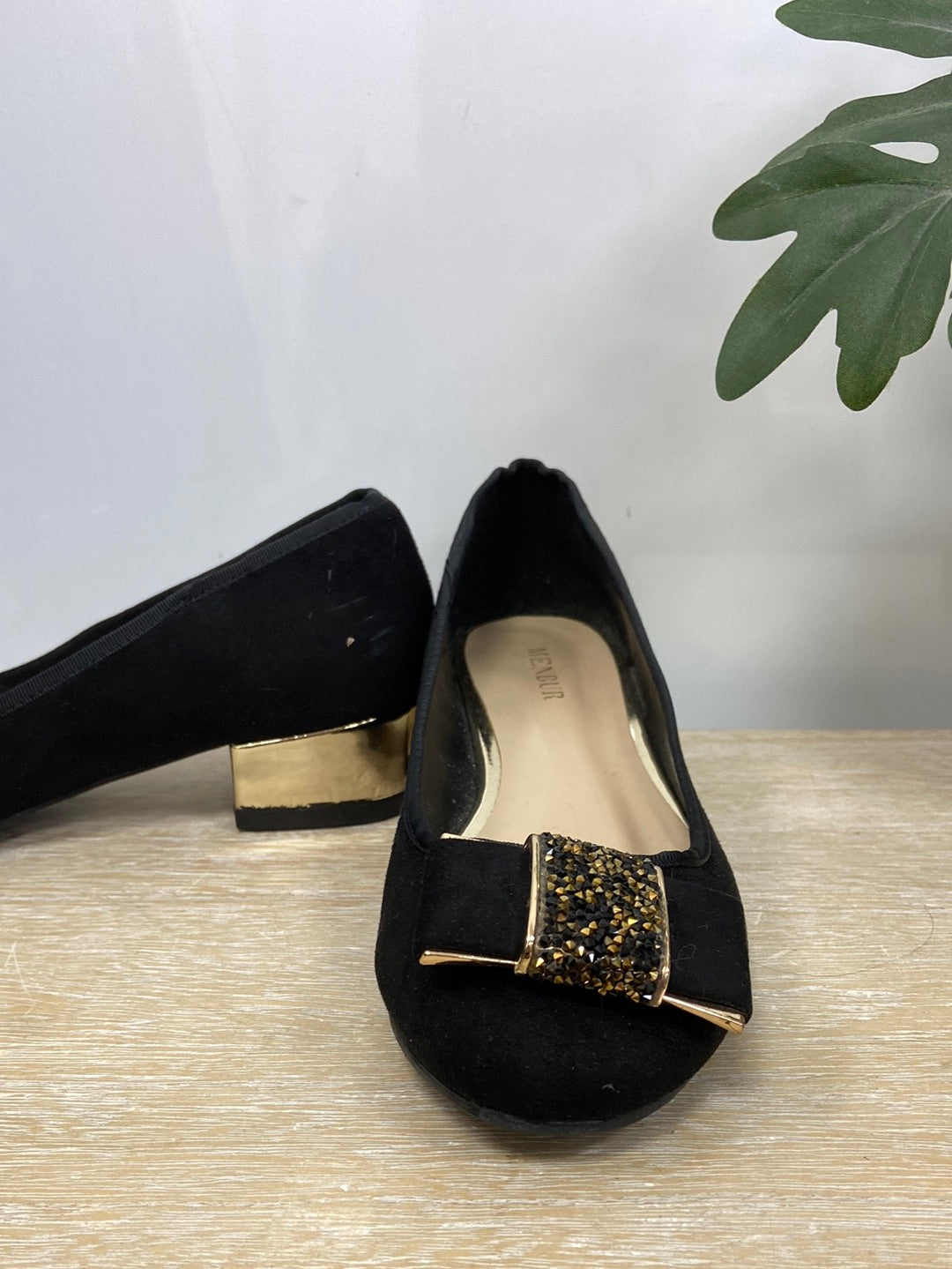 bailarinas negras de tacón con detalle de lazo y pedrería. Tacón dorado de 3.5 cm . Tara: tiene unas pequeñas marcas en el talón