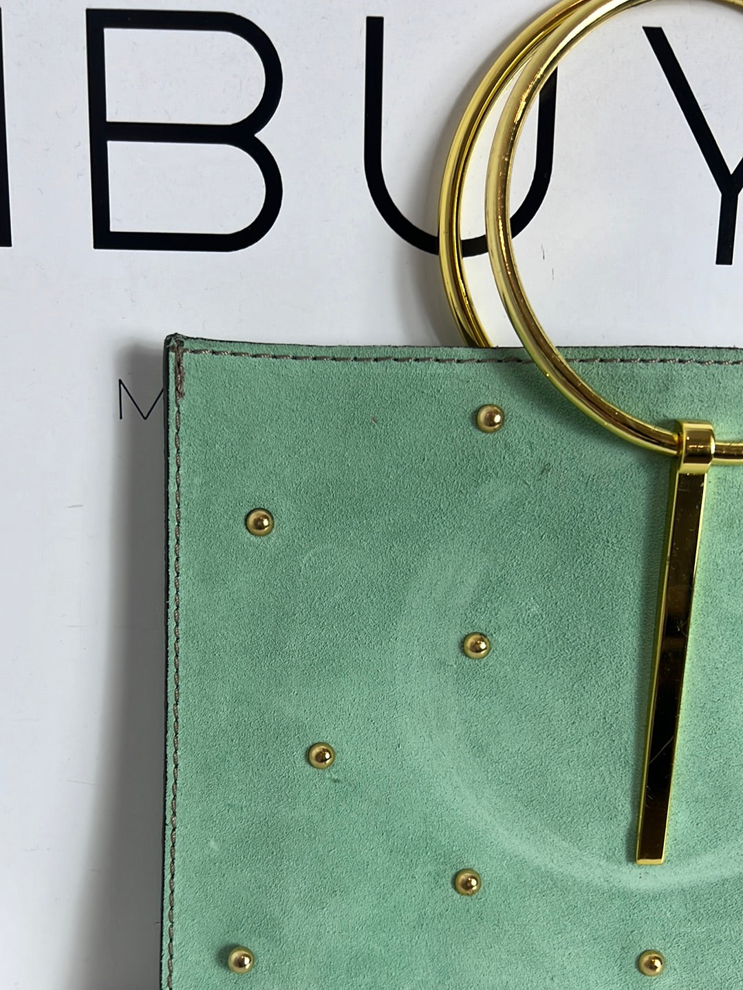 Bolso plano piel verde anillas. Tara: marcas en la piel de las anillas (foto)