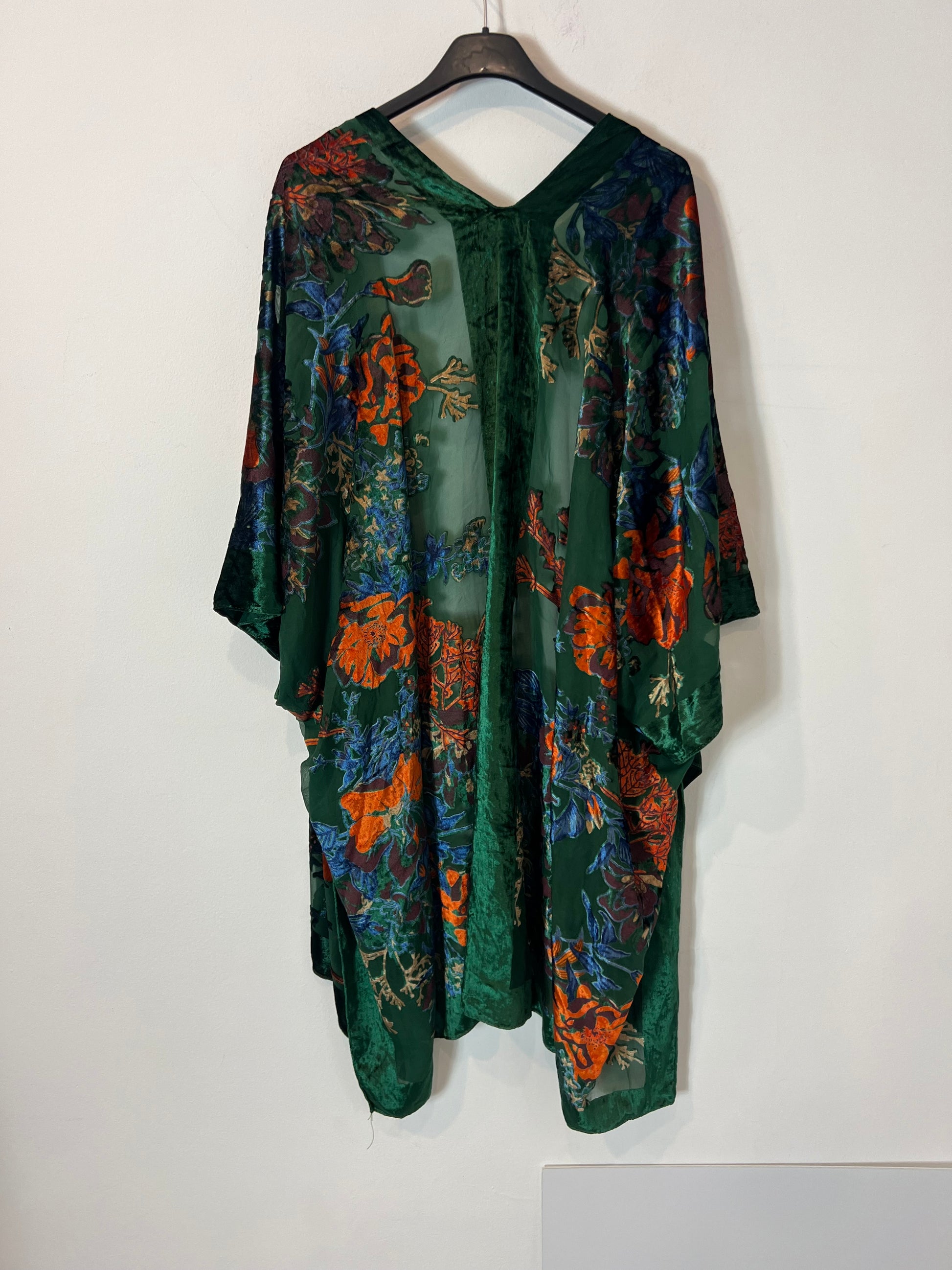 kimono fluido de flores en terciopelo con detalles semitransparentes.