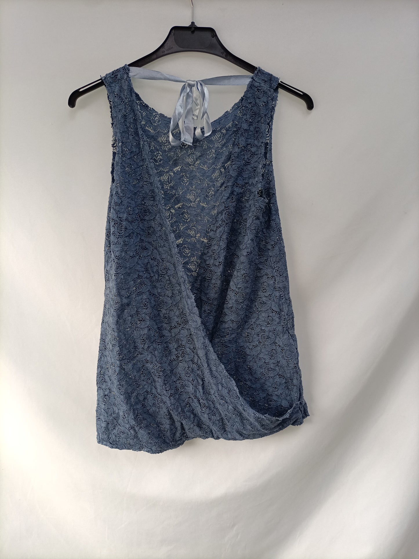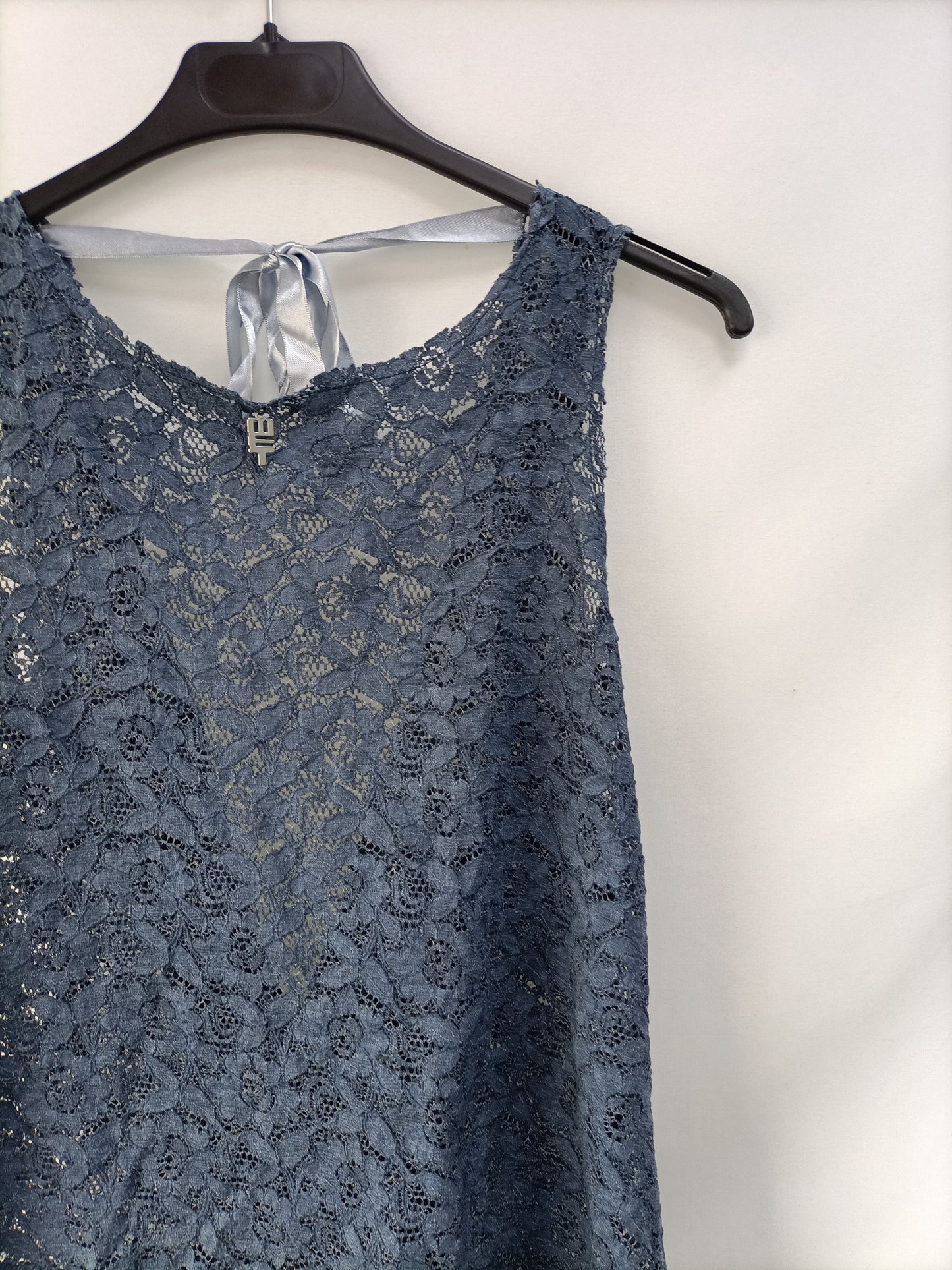 Top croché azul con espalda al aire cruzada con lazada. Largo 64 cn