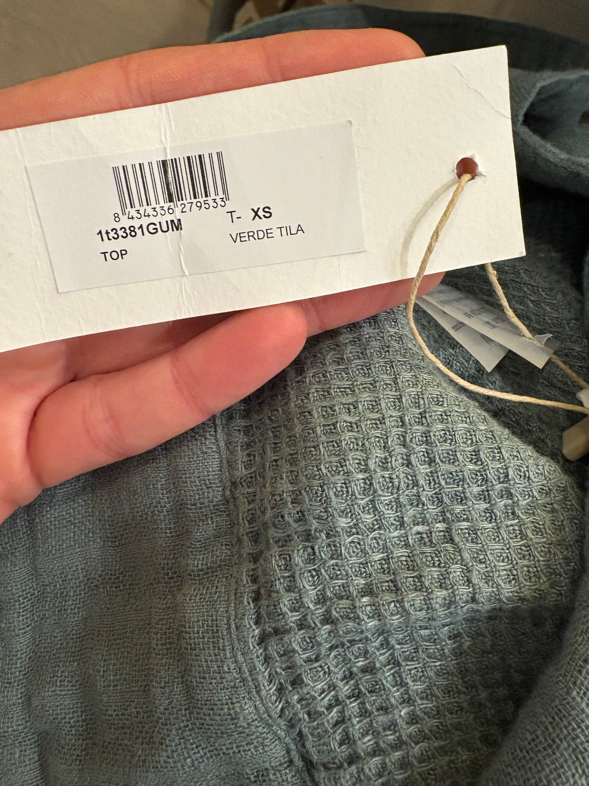 NUEVO CON ETIQUETA. top verde agua abotonado de tejido con textura. De sisa a sisa 39 cm, largo 52 cm