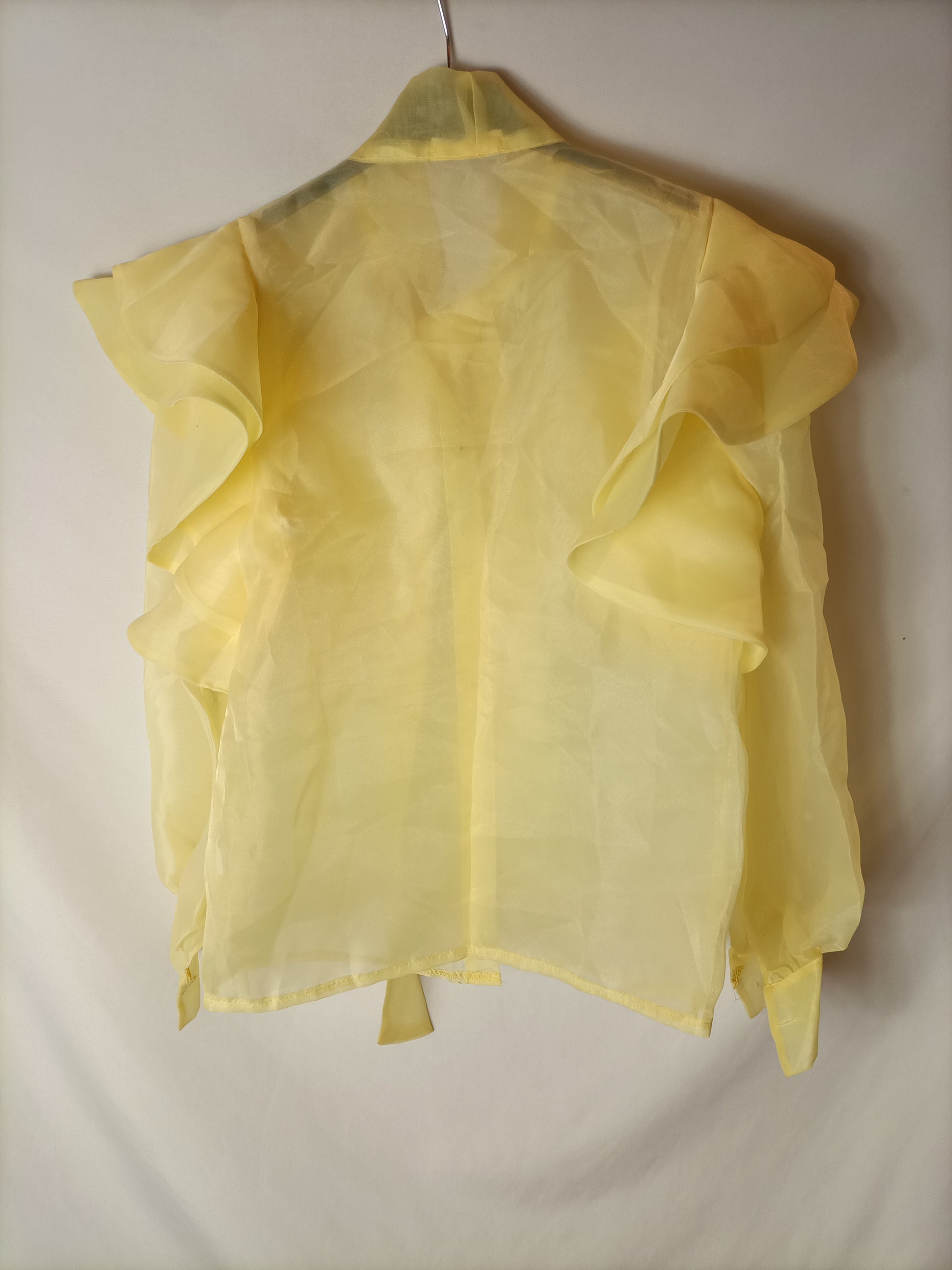 blusa amarilla de tejido tipo gasa semitrasparente con volantes.