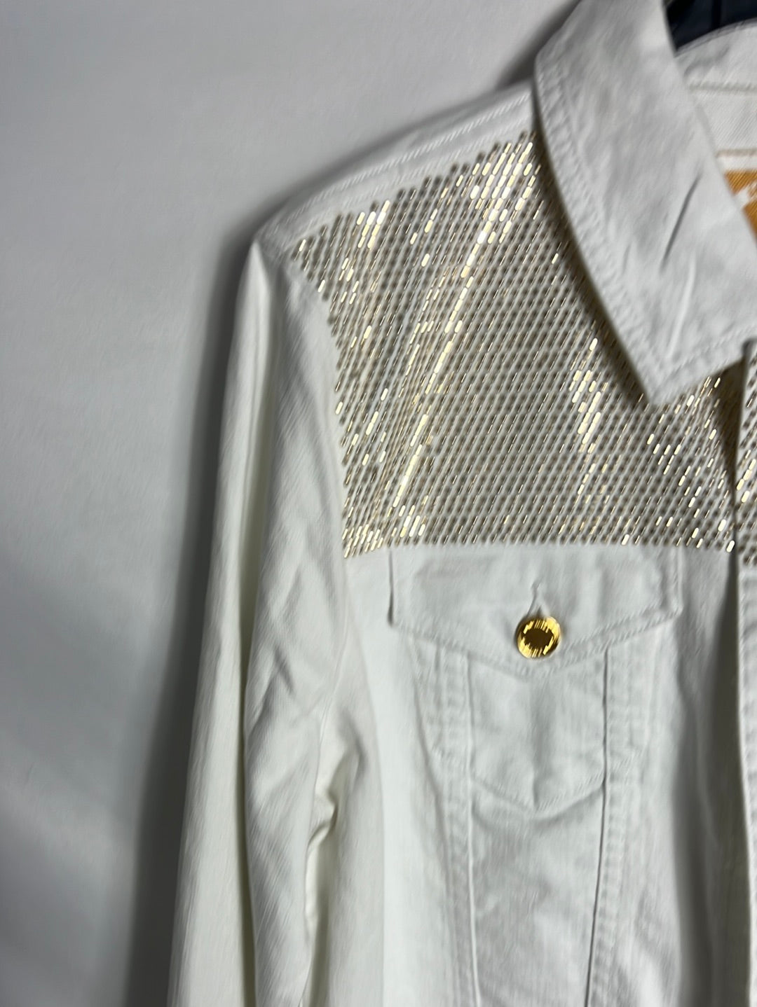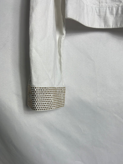 Chaqueta denim tachuelas doradas. Hombros 38cm, largo 49cmTara: marca cuello amarilla poco perceptible