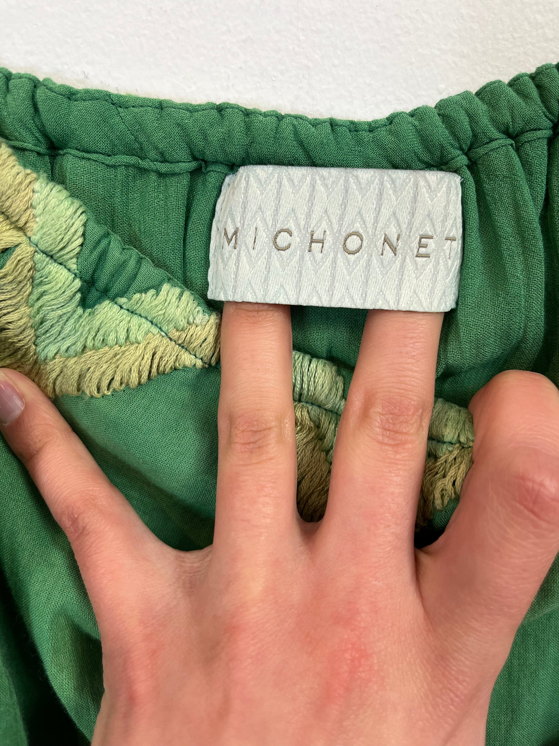 Vestido verde con detalles bordados y flecos. Largo 106 cm, de sisa a sisa 52 cm. TARA: tejido ligeramente desgastado.