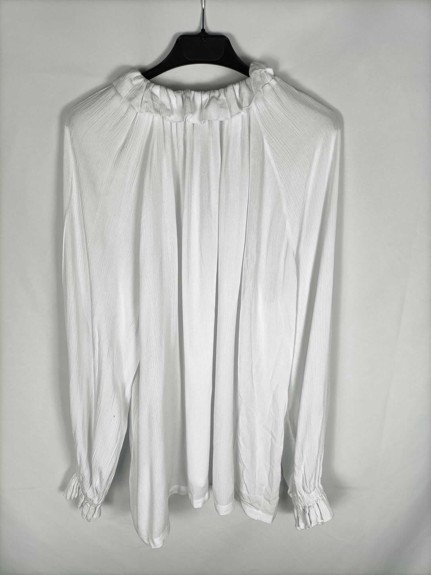 Mi&co. Blusa blanca de tejido arrugado estilo oversized con detalle de volante en el cuello. Muy elástica. Largo 73 cm